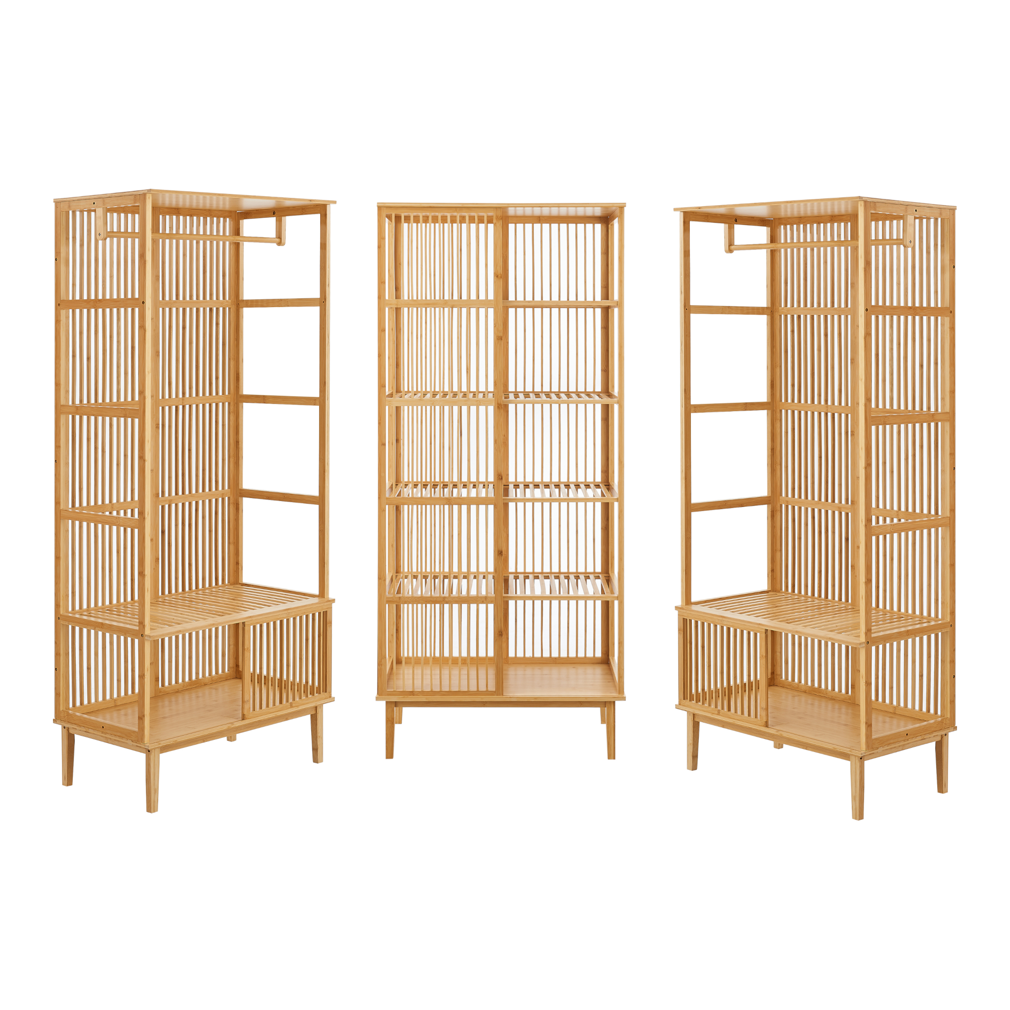 Setul de garderobă din bambus este o soluție practică și elegantă pentru organizarea hainelor și accesoriilor în hol, dormitor sau dressing. Compus din 2 suporturi pentru haine și 1 raft de depozitare cu 5 polițe, acest ansamblu oferă spațiu generos pentru haine pe umeraș, încălțăminte, pălării, genți și alte obiecte de uz zilnic.