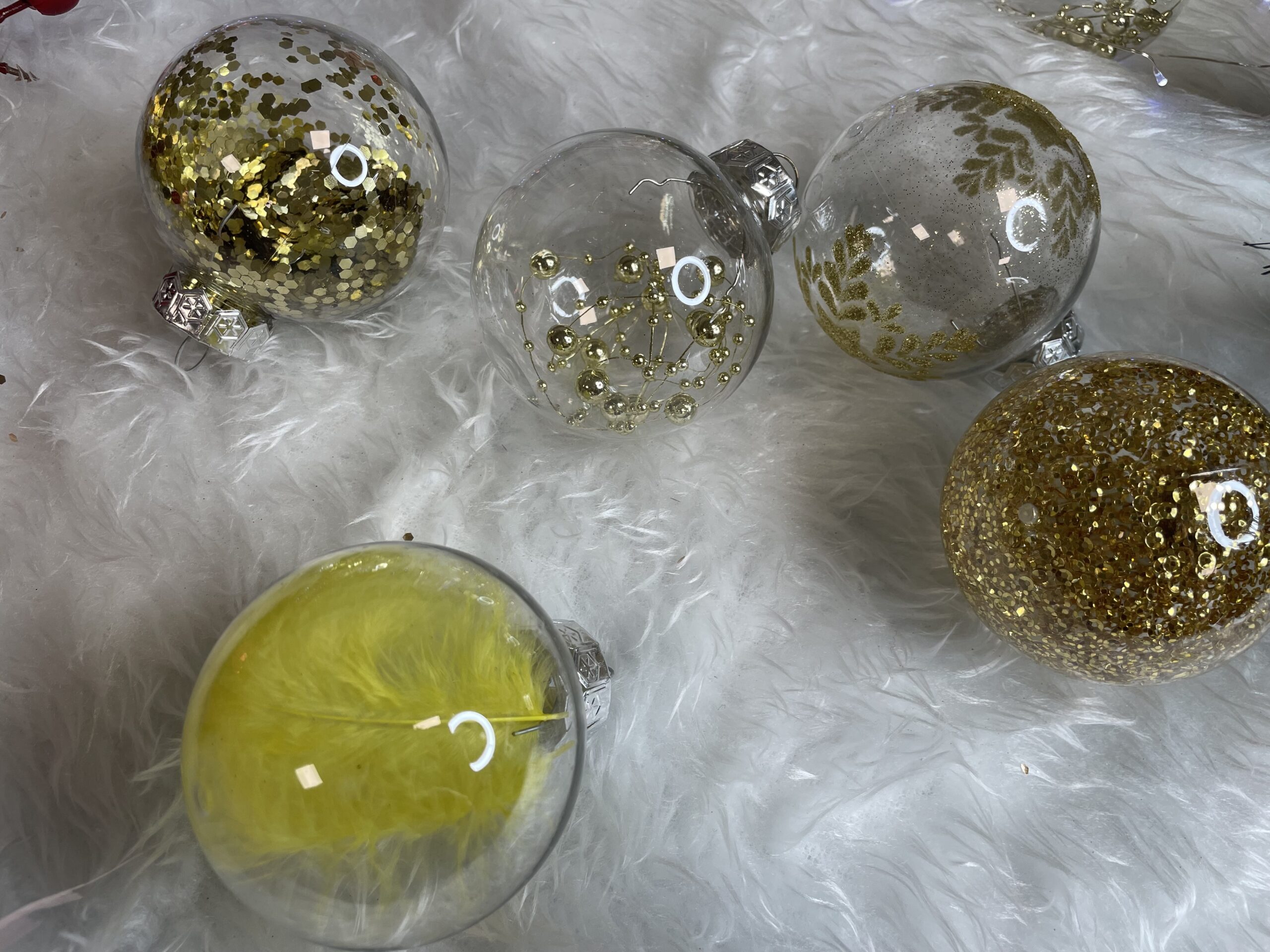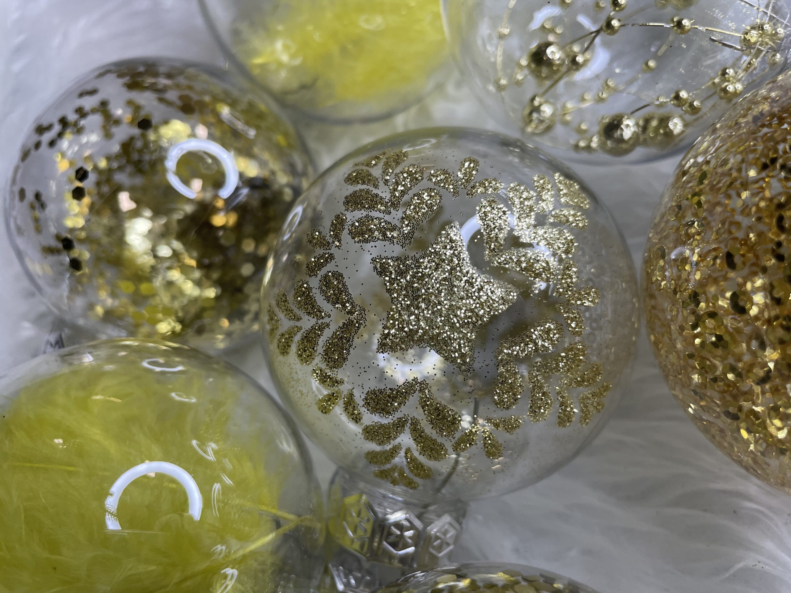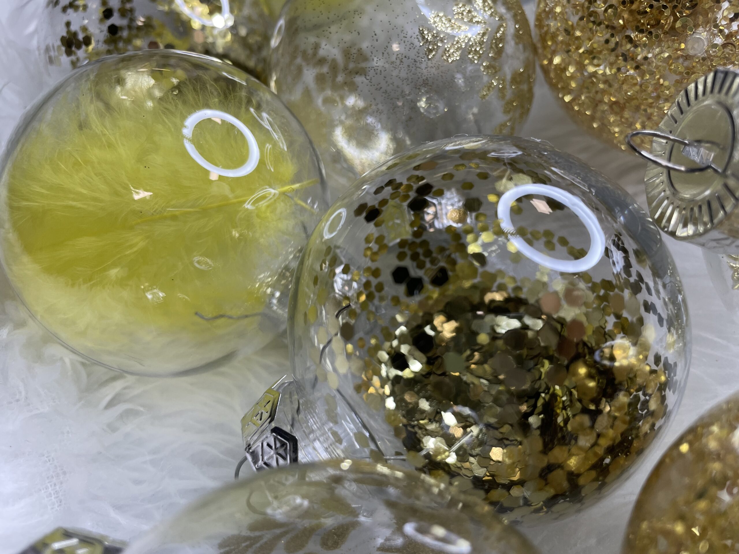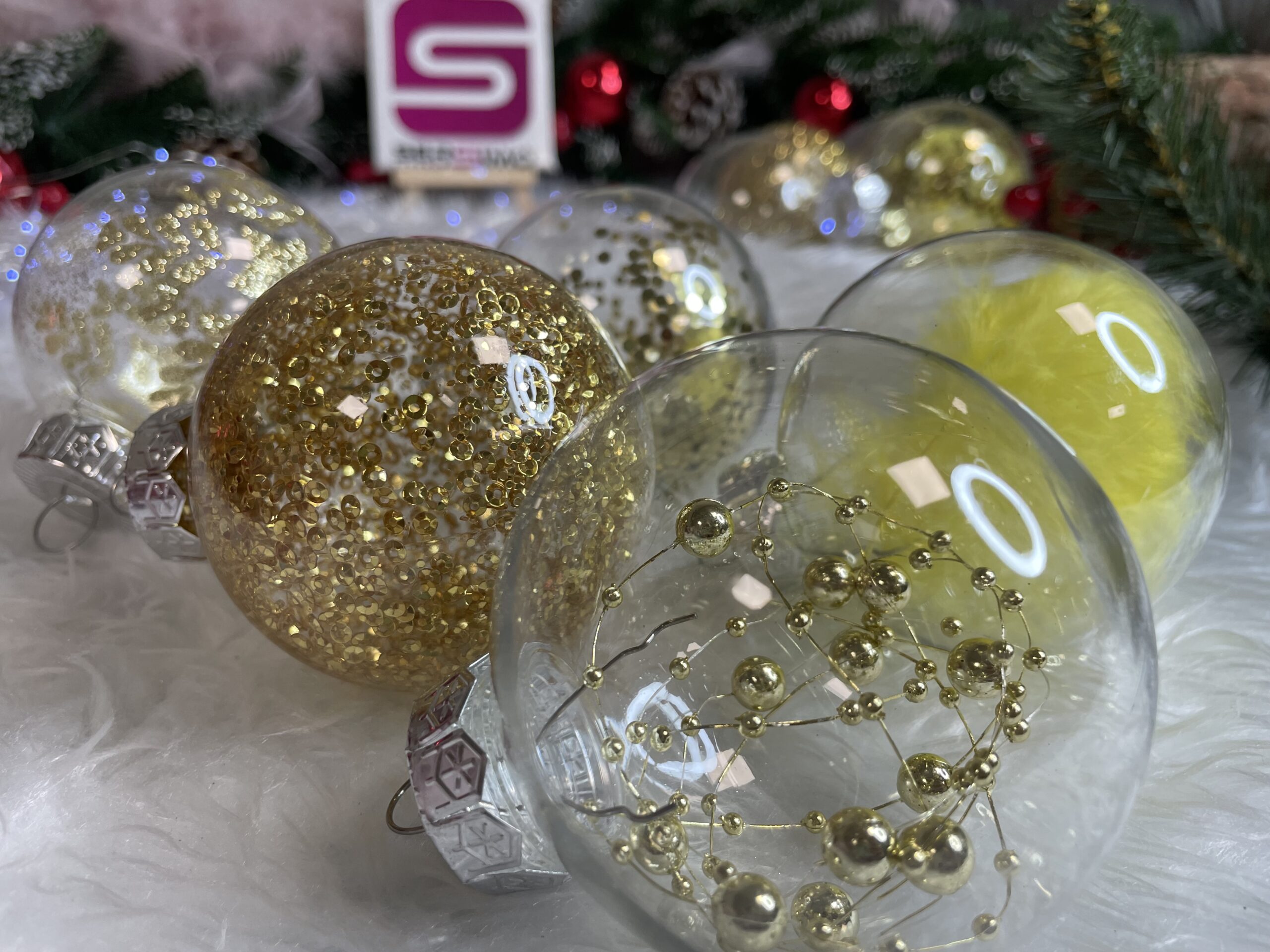Setul include modele variate, cu texturi și finisaje strălucitoare, pentru un decor bogat și armonios. Suprafețele lucioase, paietele, confetti-ul și detaliile aurii reflectă frumos lumina instalațiilor, creând o atmosferă caldă și festivă.