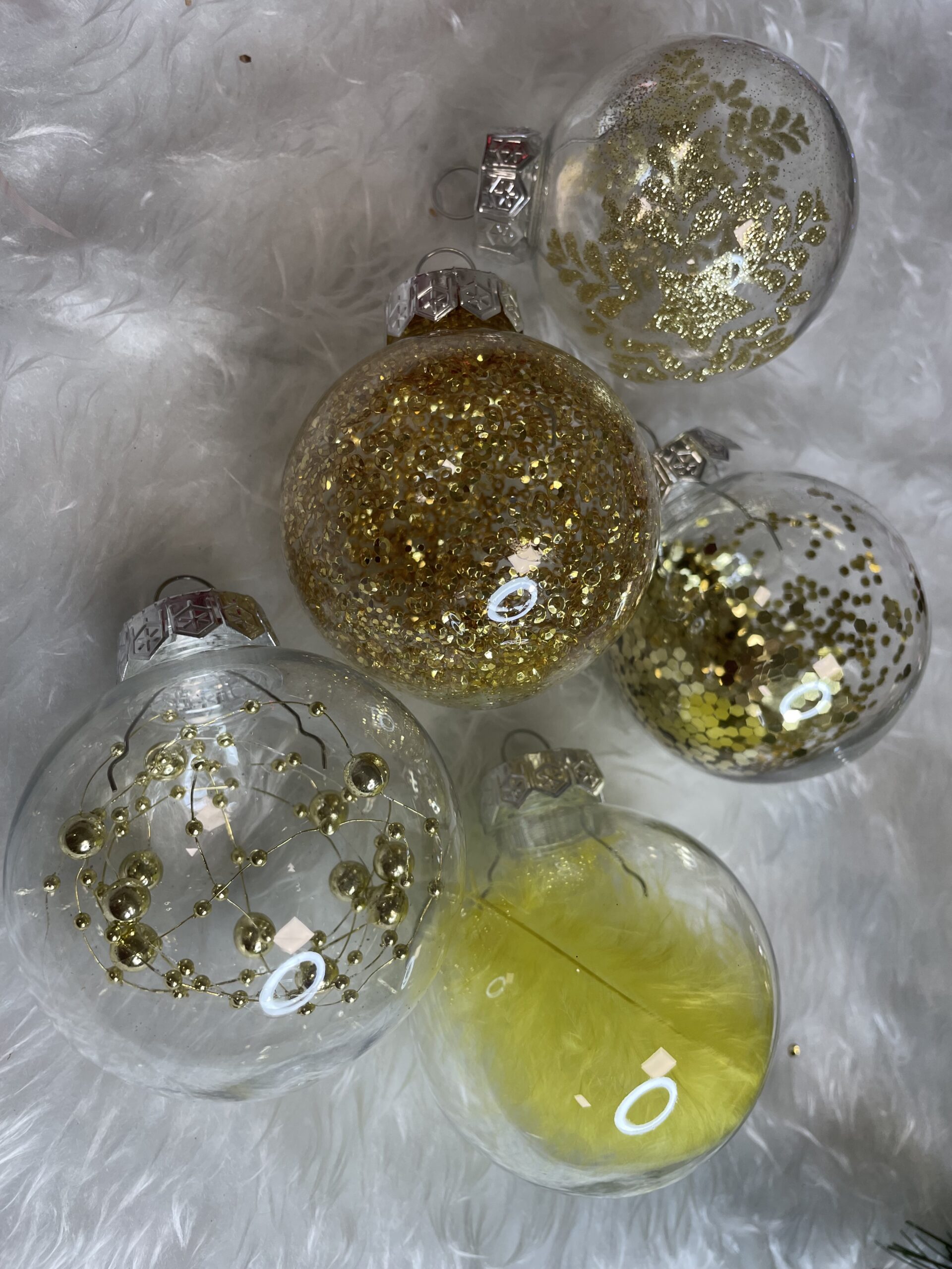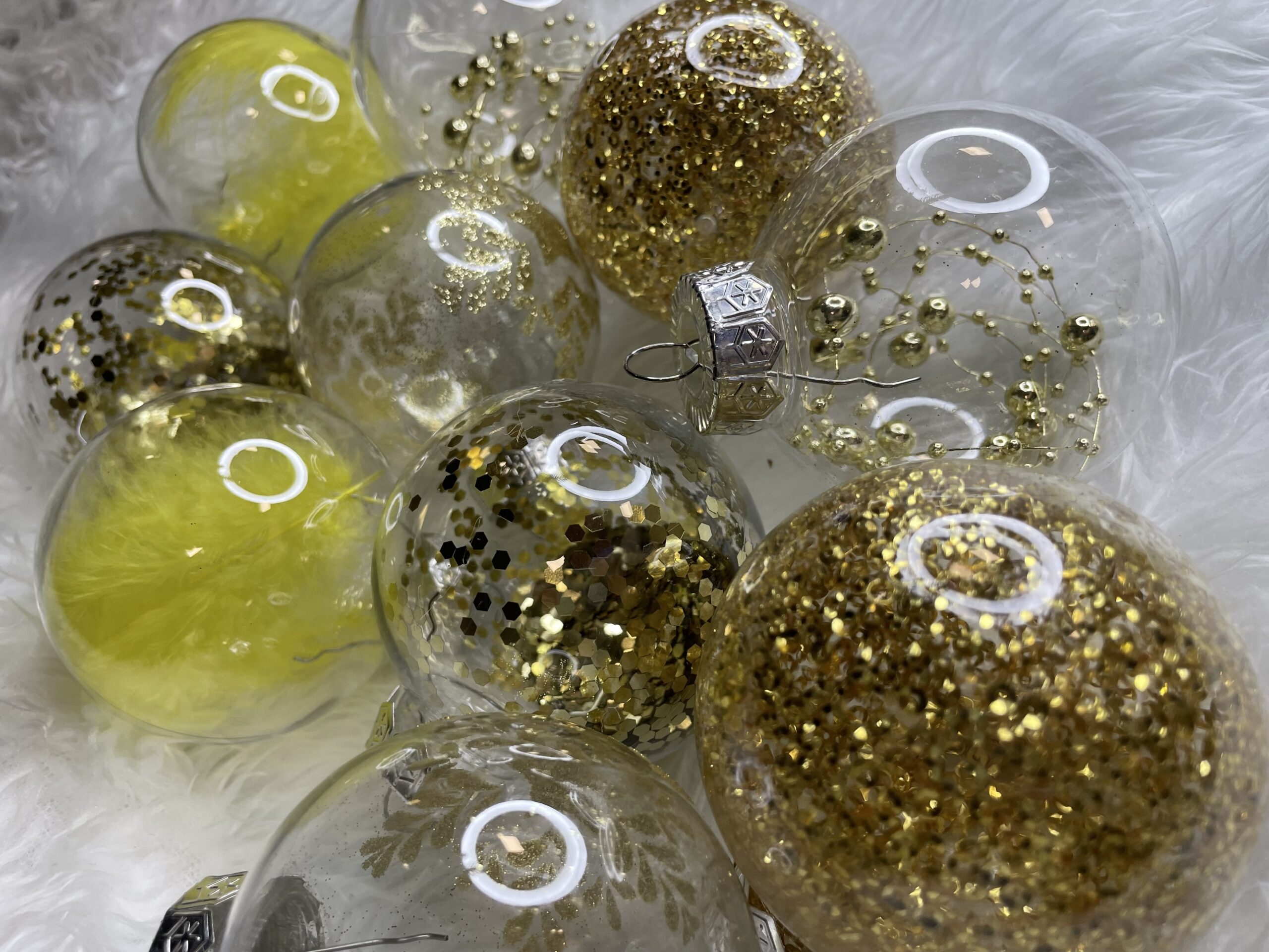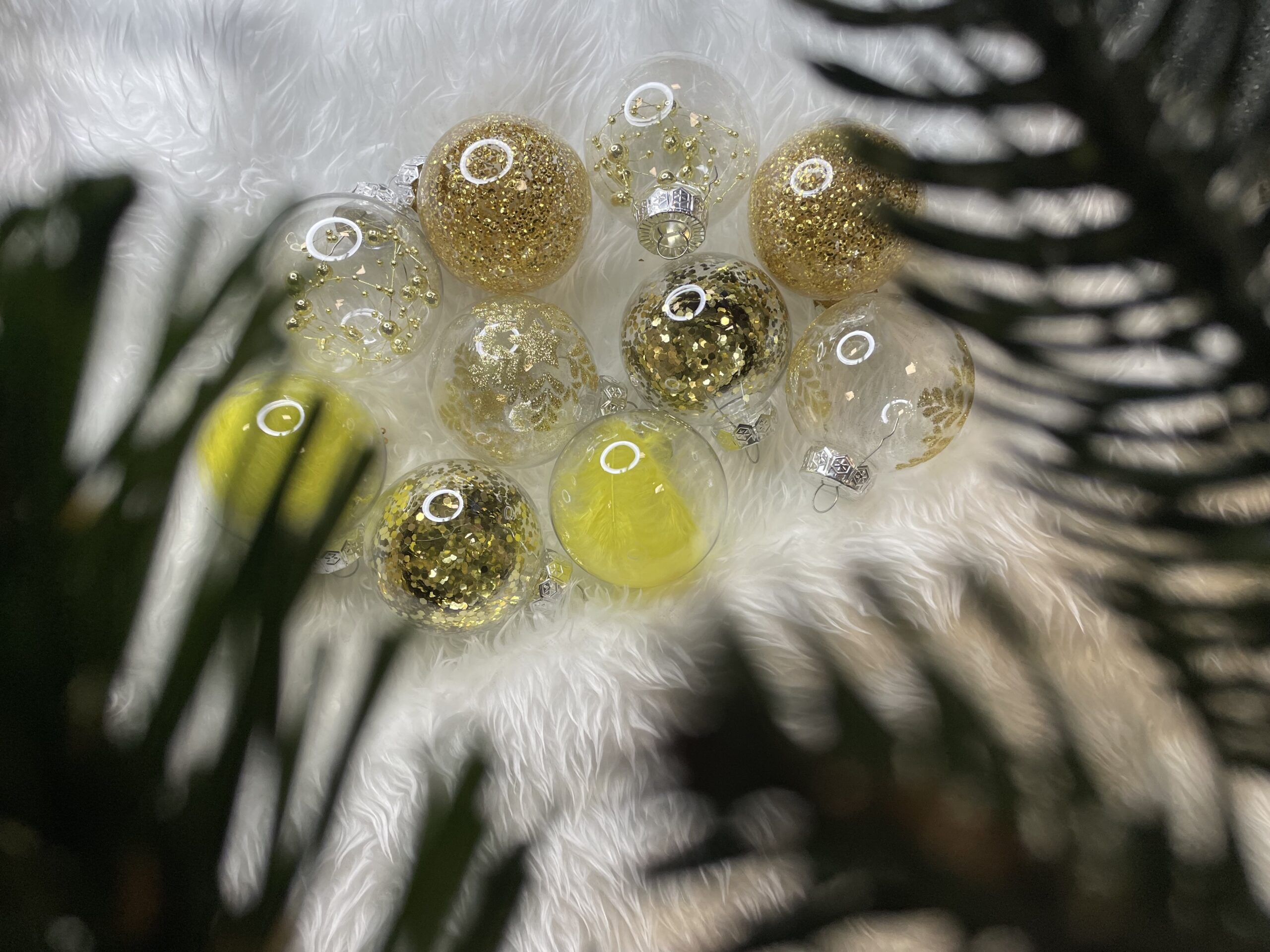 Setul include modele variate, cu texturi și finisaje strălucitoare, pentru un decor bogat și armonios. Suprafețele lucioase, paietele, confetti-ul și detaliile aurii reflectă frumos lumina instalațiilor, creând o atmosferă caldă și festivă.