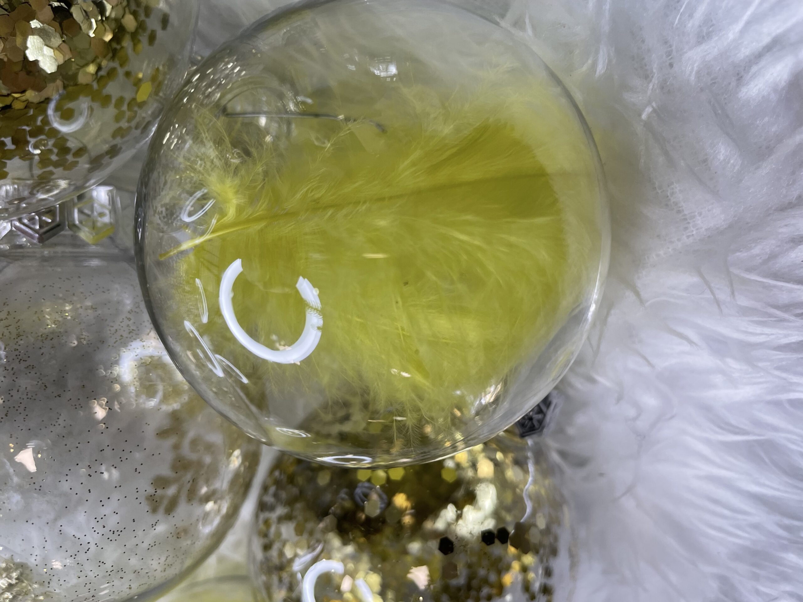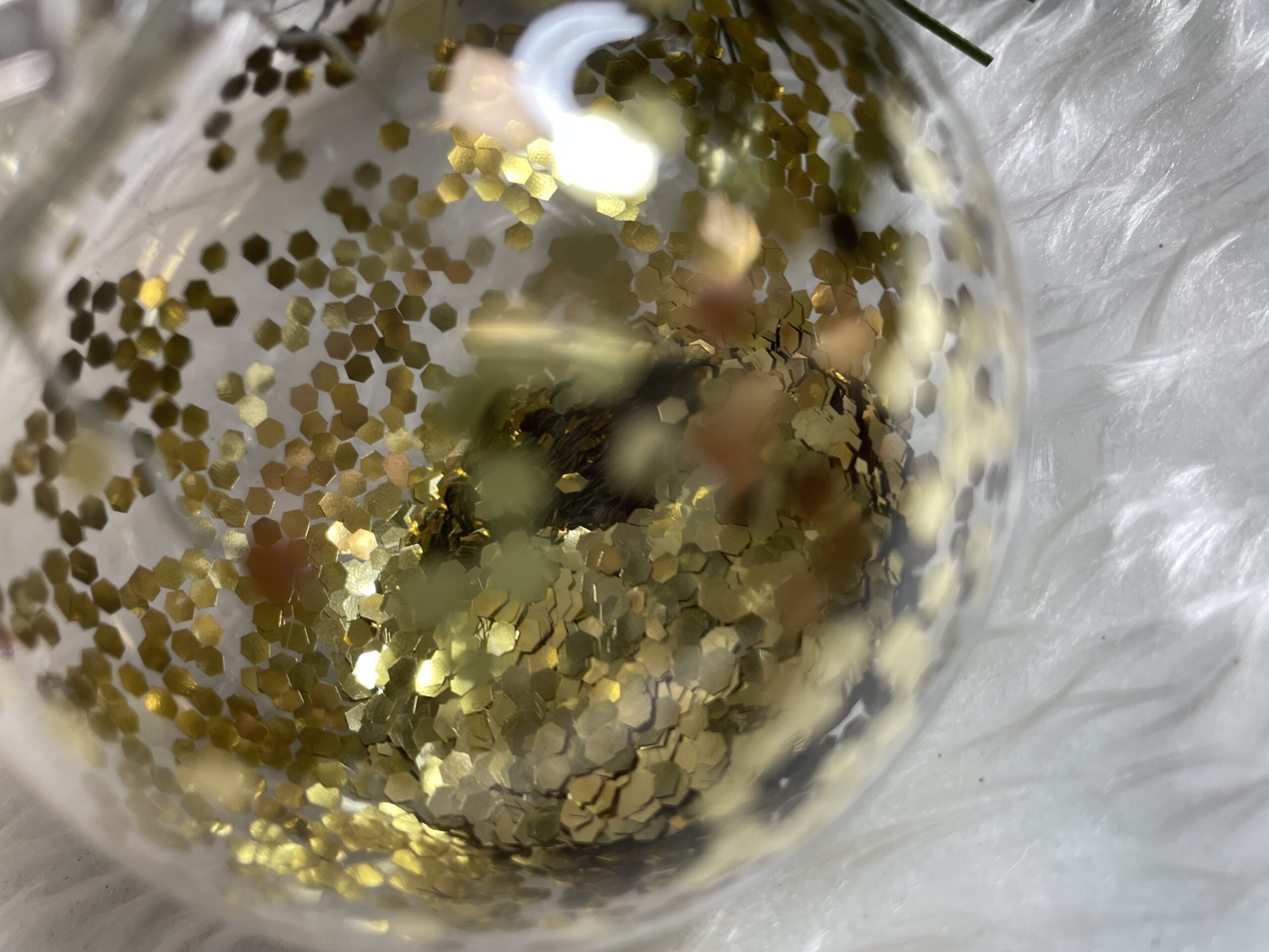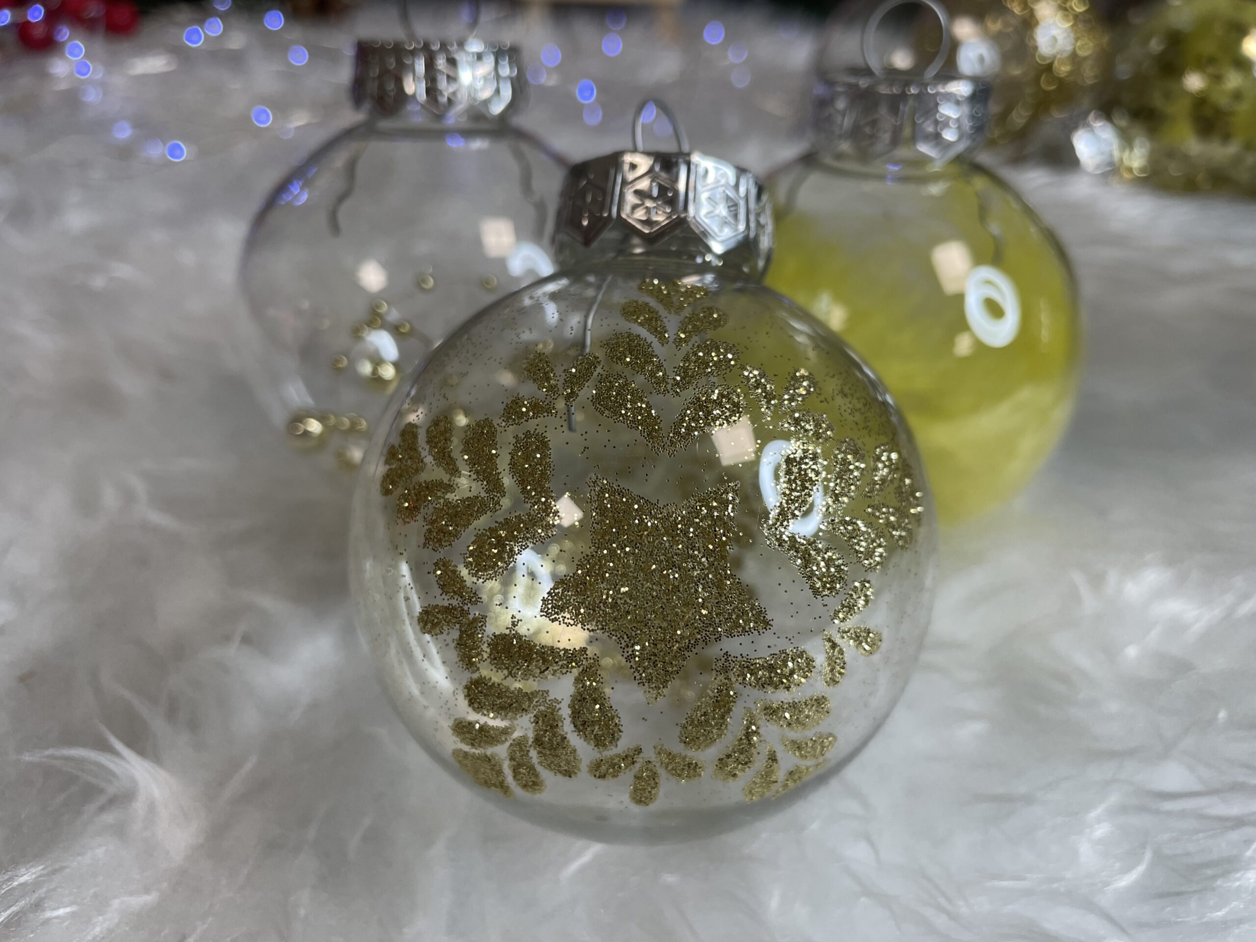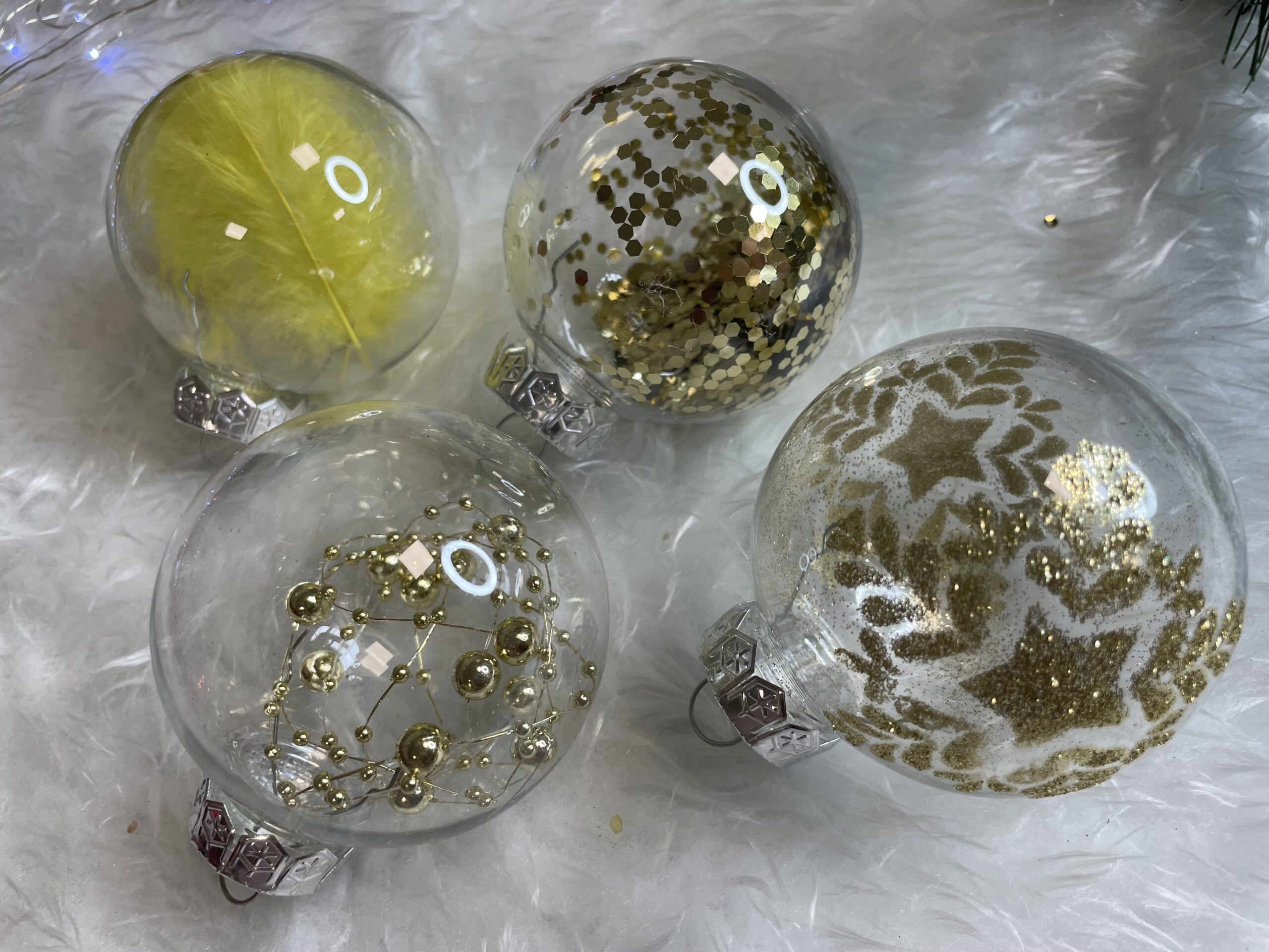 Setul include modele variate, cu texturi și finisaje strălucitoare, pentru un decor bogat și armonios. Suprafețele lucioase, paietele, confetti-ul și detaliile aurii reflectă frumos lumina instalațiilor, creând o atmosferă caldă și festivă.