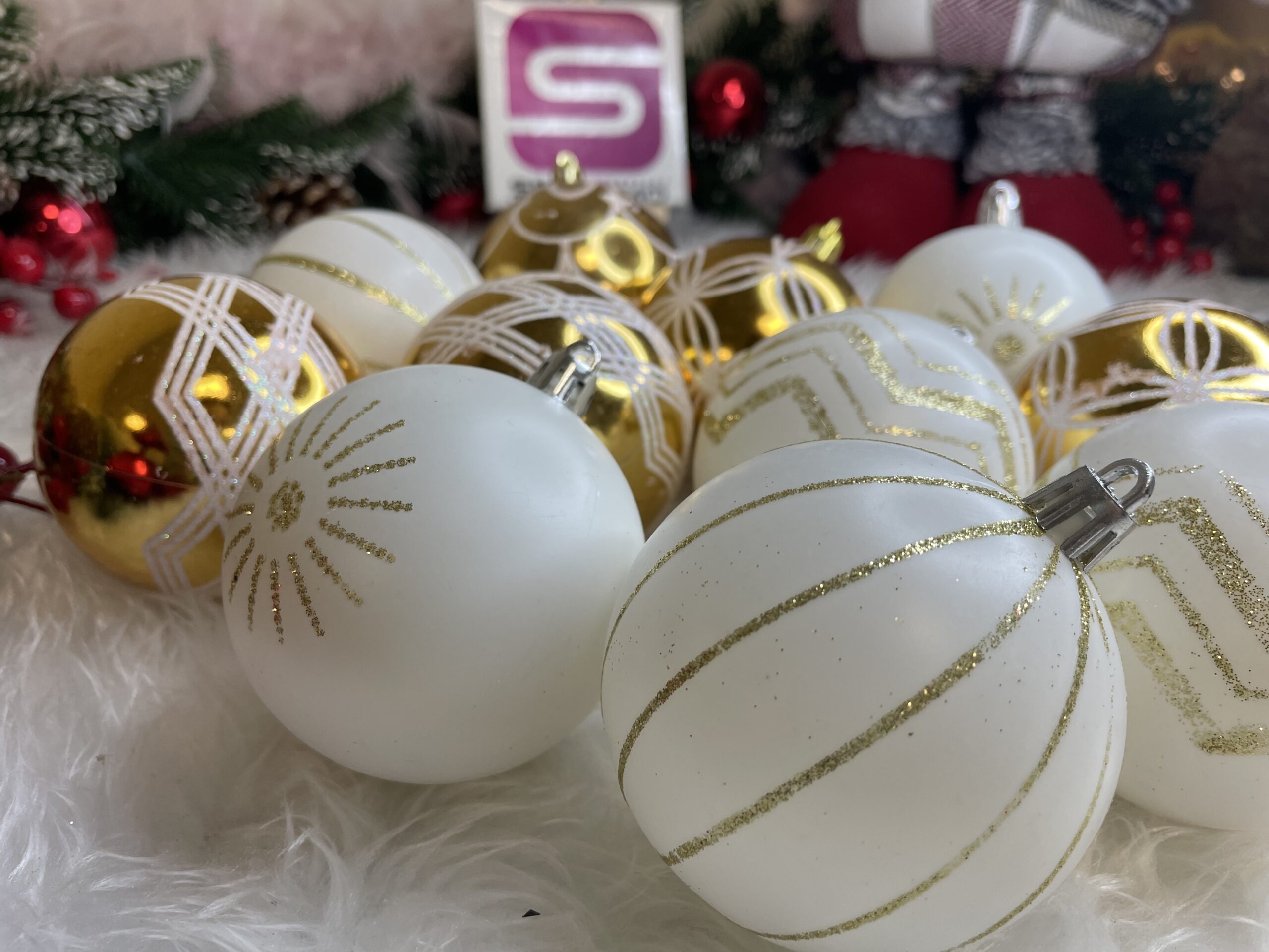 Adaugă bradului un aer elegant și festiv cu acest set de globuri de Crăciun în nuanțe alb auriu. Cele 30 de globuri au un design variat, cu finisaje mate, lucioase și cu sclipici, fiind ideale pentru a crea un decor armonios și rafinat. Realizate din plastic rezistent, sunt o alegere practică pentru locuințele cu copii sau animale de companie.