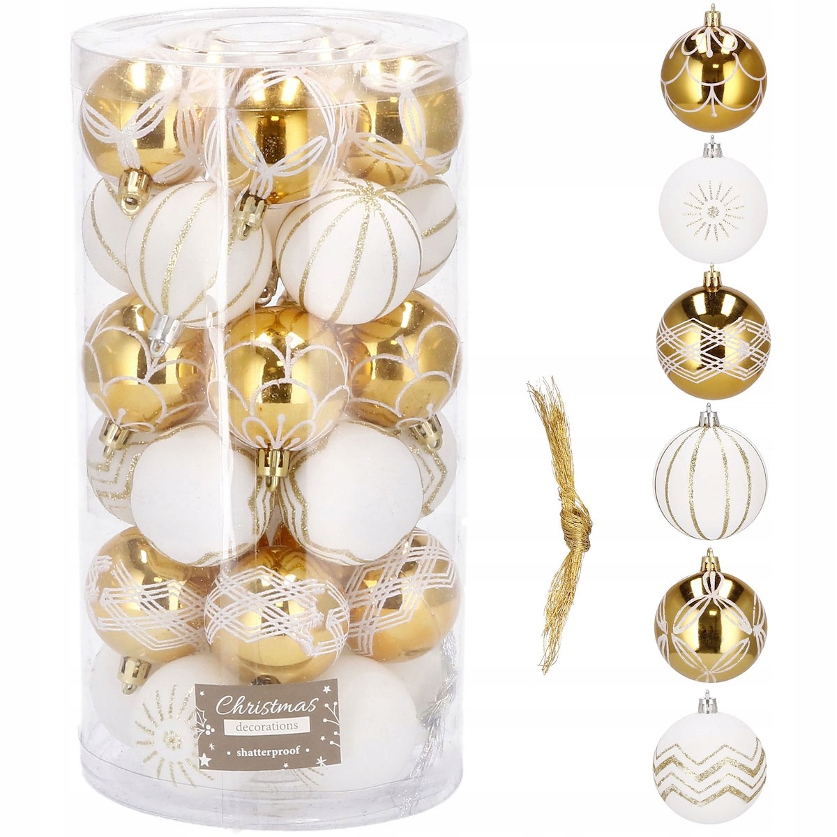 - Conținut set: 15 x globuri albe, 15 x globuri aurii