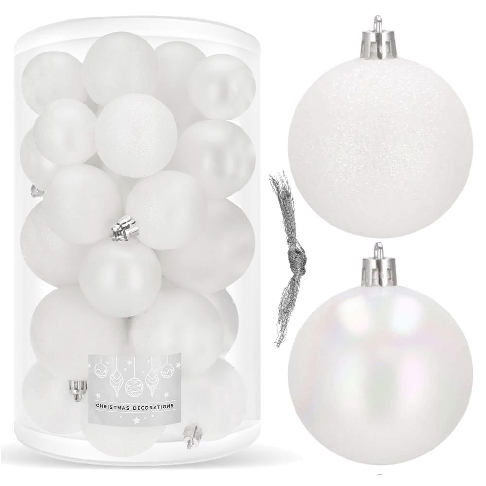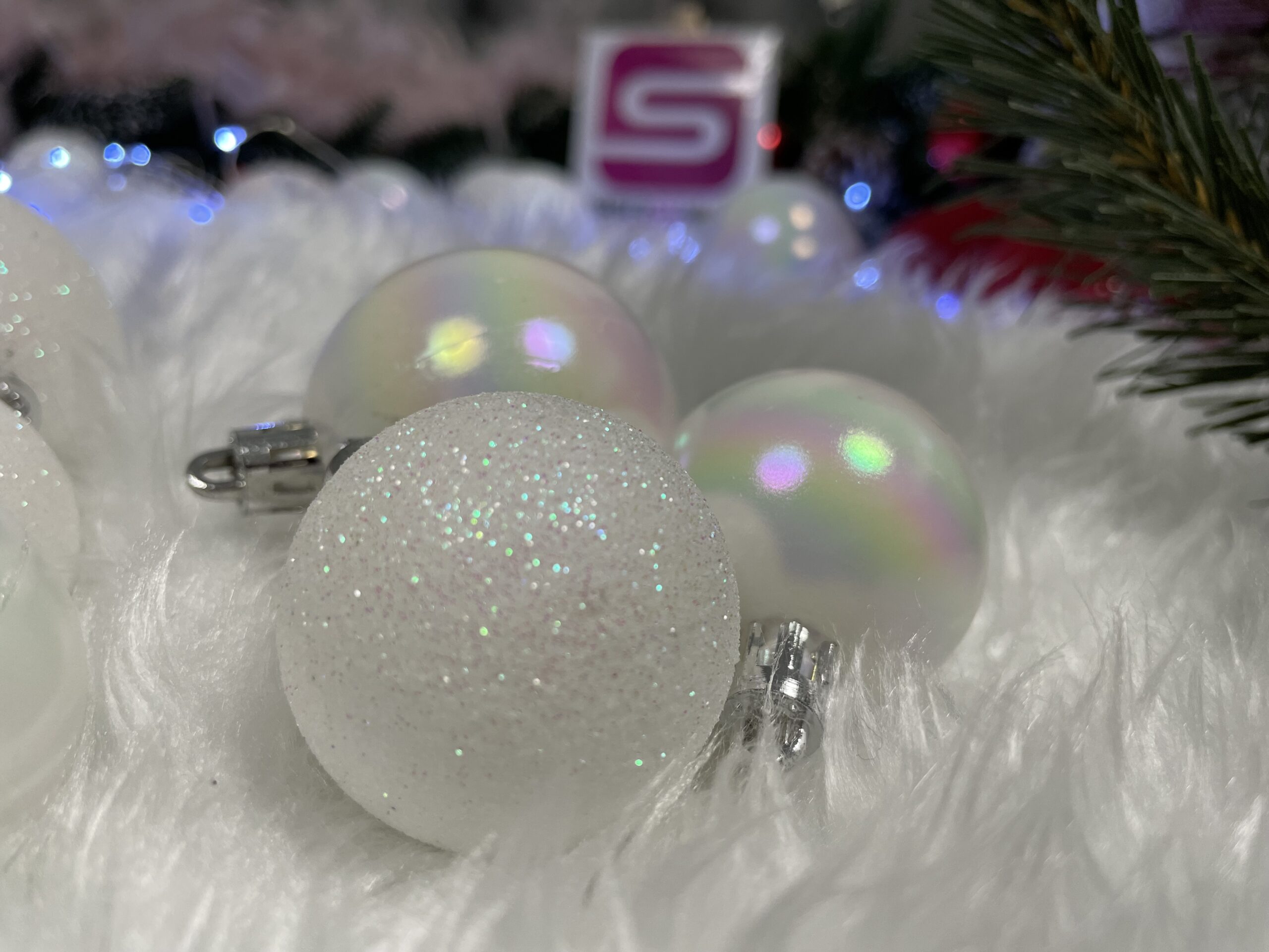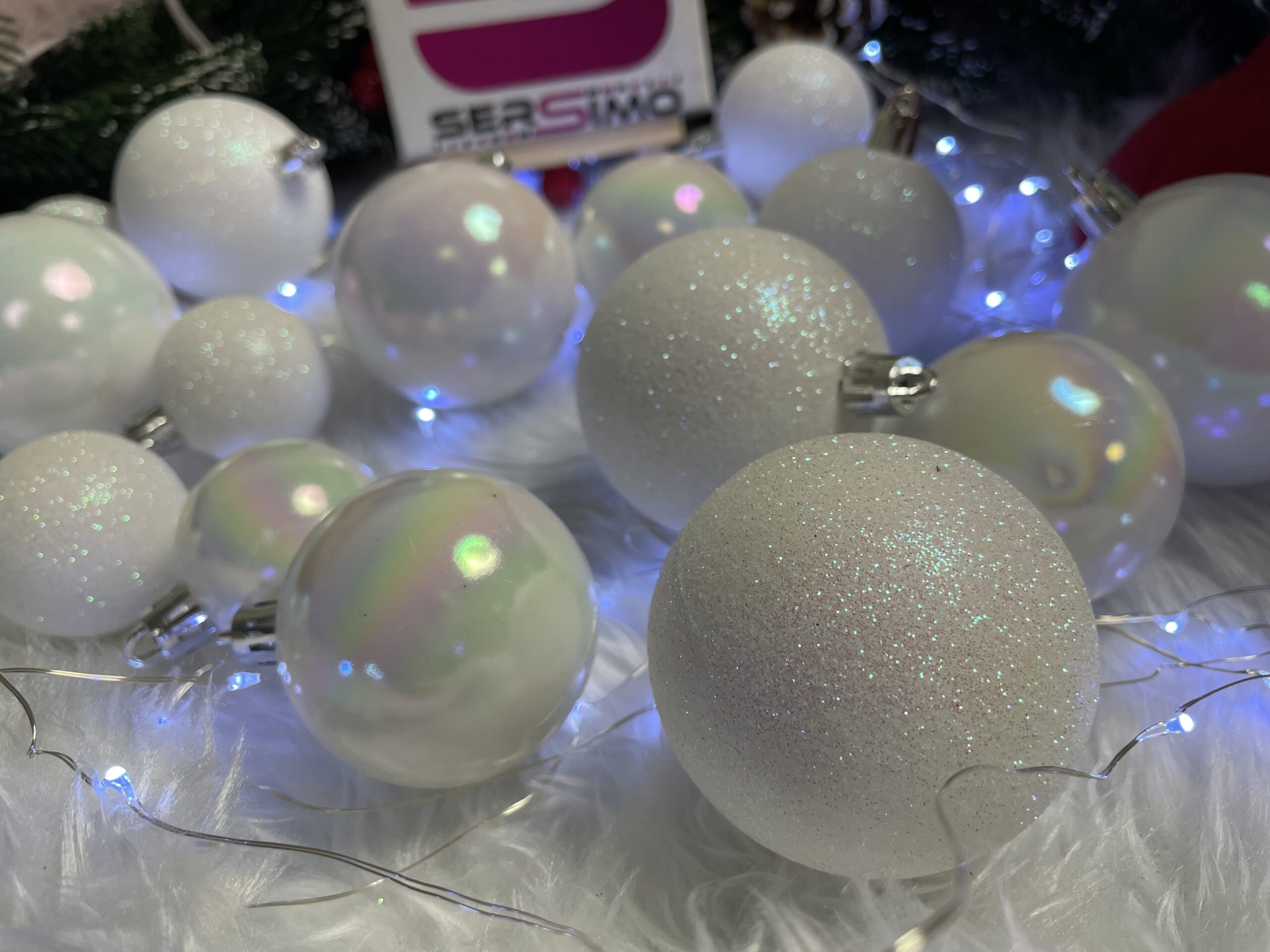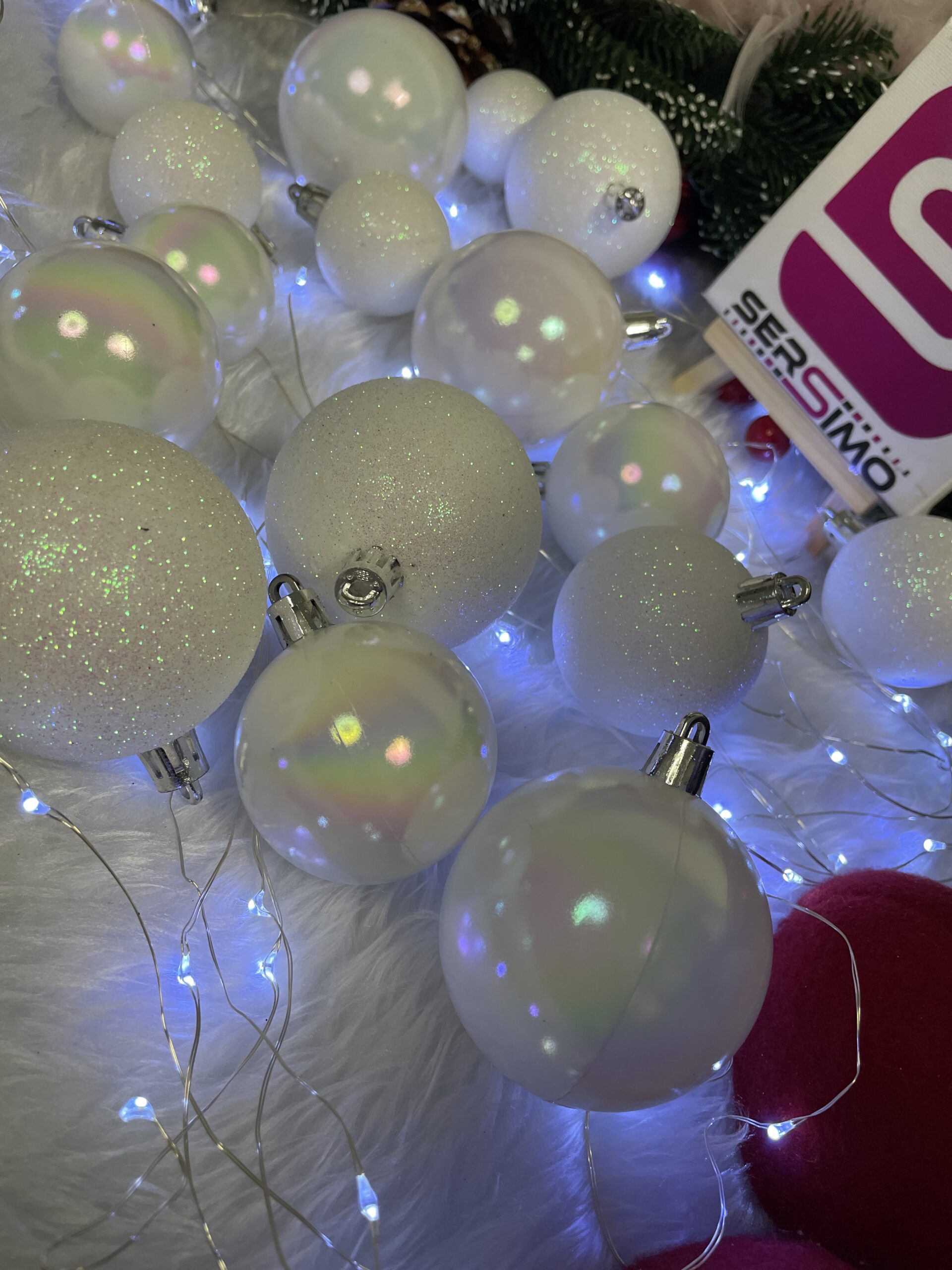 Adauga un plus de eleganta decorului festiv cu acest set de globuri de Craciun albe, potrivit pentru brad, aranjamente de masa sau decoratiuni pentru usa. Cele 30 de piese vin in 3 dimensiuni si 3 finisaje diferite, pentru un aspect armonios, luminos si rafinat. Fiind realizate din plastic incasabil, globurile sunt o alegere practica si sigura pentru locuintele cu copii sau animale de companie.