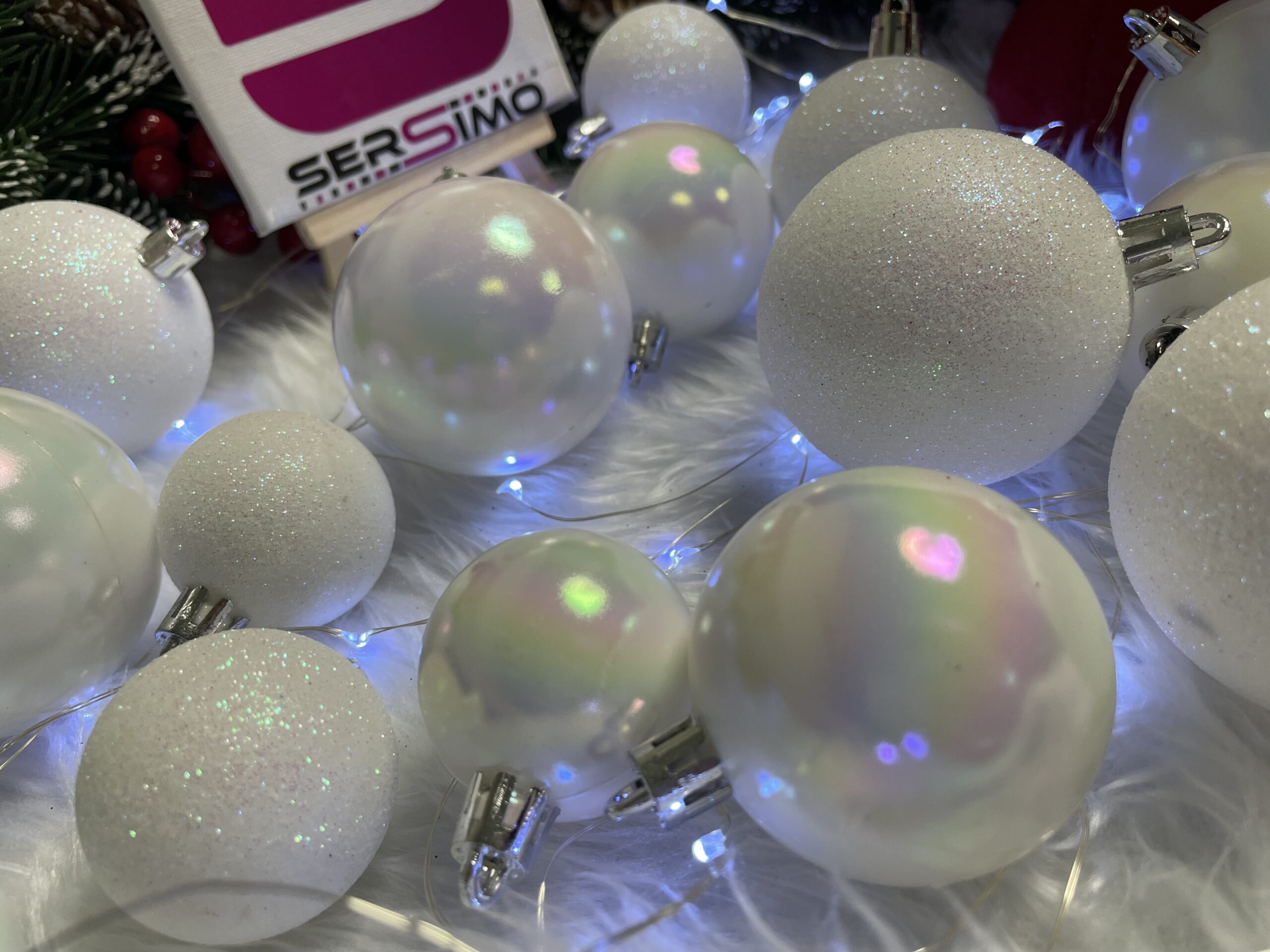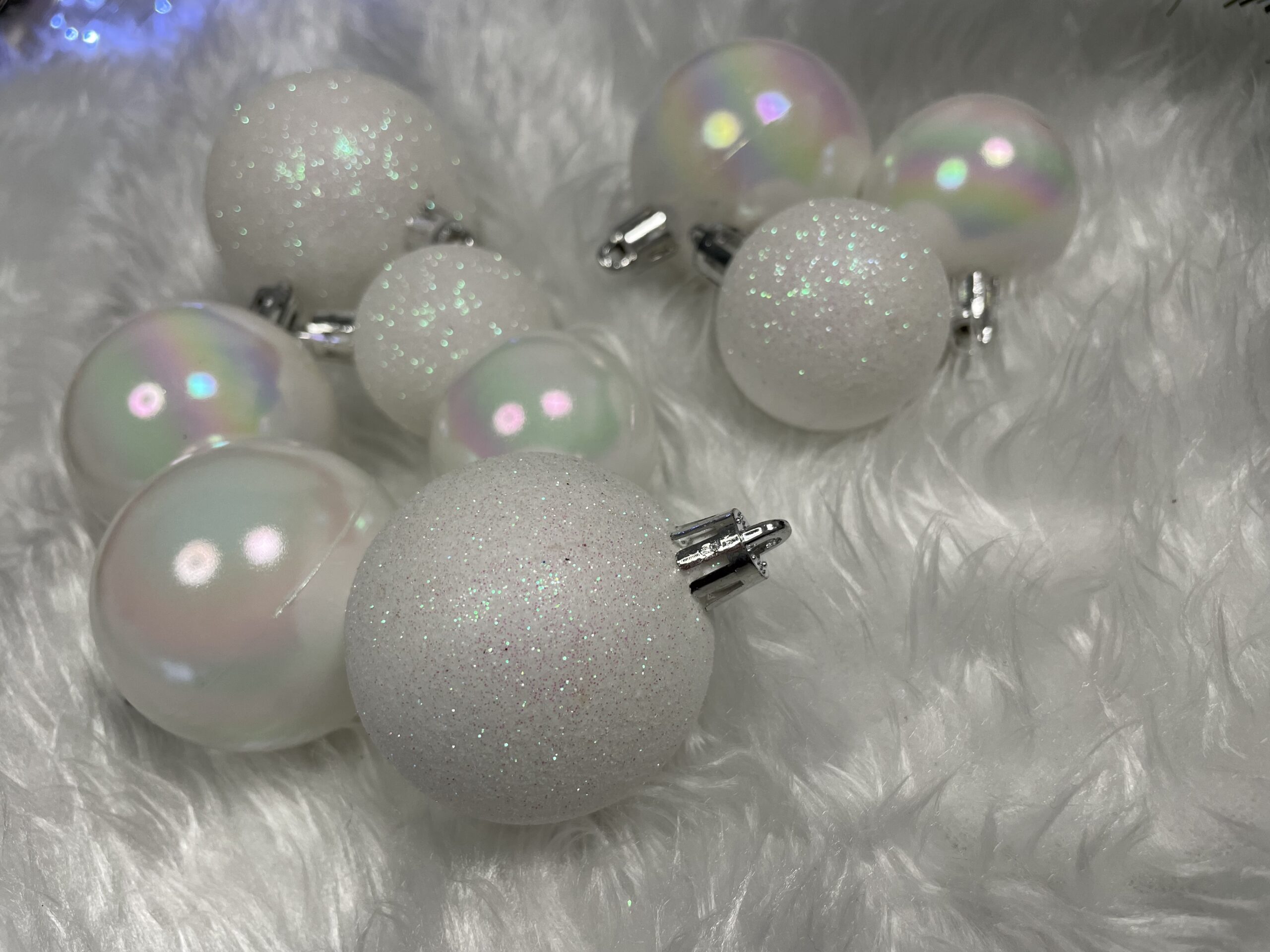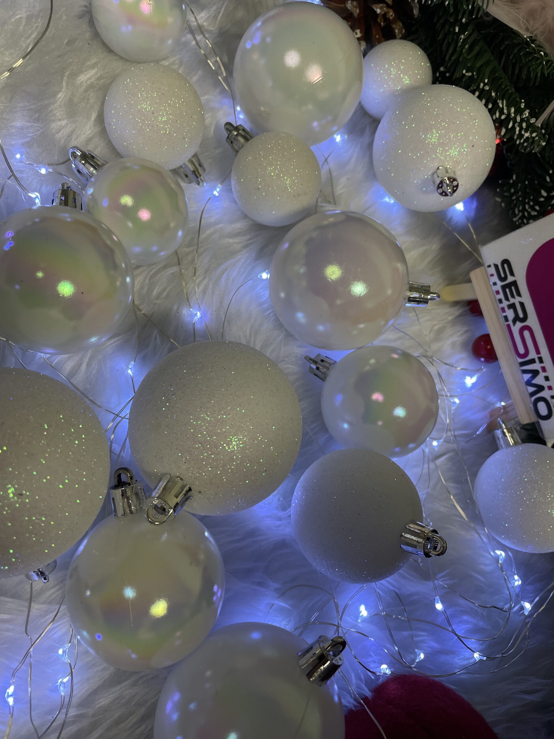 Adauga un plus de eleganta decorului festiv cu acest set de globuri de Craciun albe, potrivit pentru brad, aranjamente de masa sau decoratiuni pentru usa. Cele 30 de piese vin in 3 dimensiuni si 3 finisaje diferite, pentru un aspect armonios, luminos si rafinat. Fiind realizate din plastic incasabil, globurile sunt o alegere practica si sigura pentru locuintele cu copii sau animale de companie.