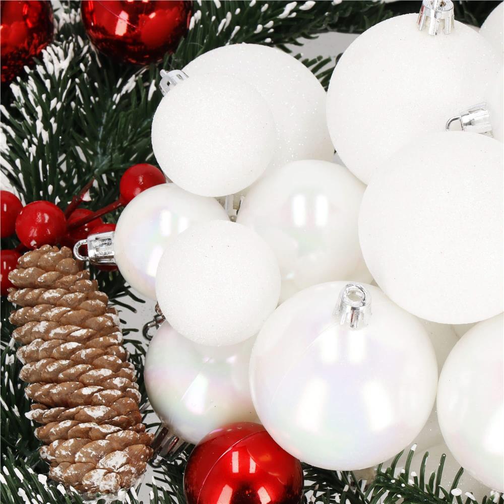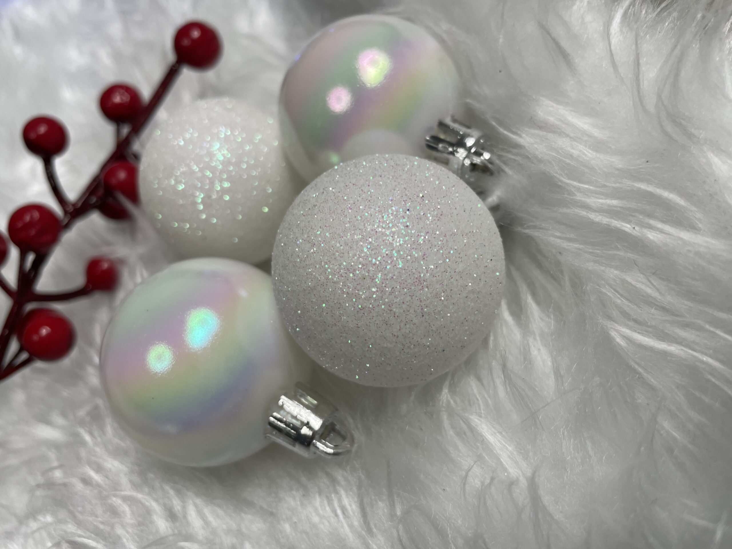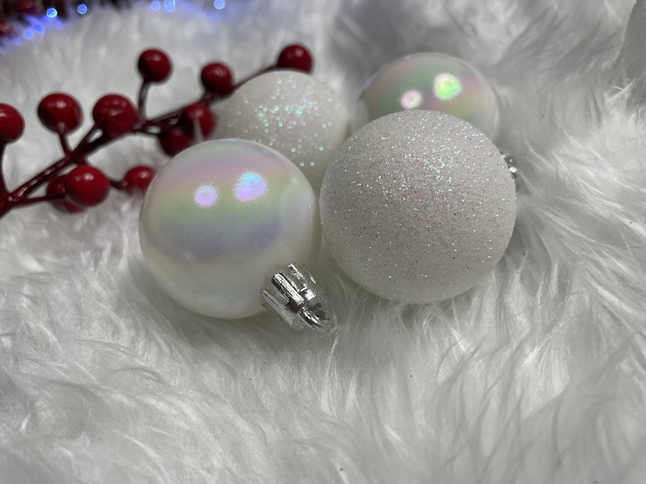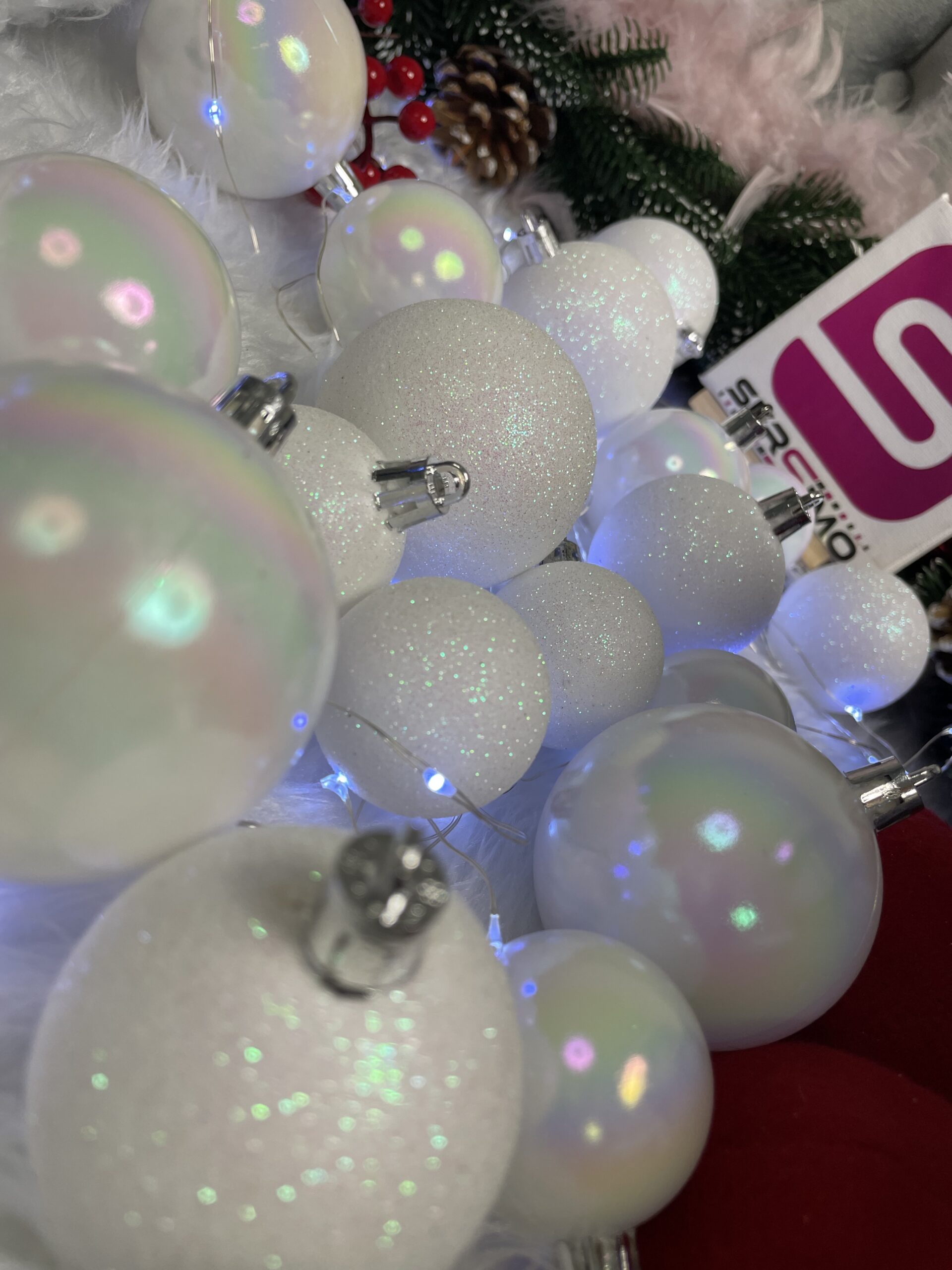 Adauga un plus de eleganta decorului festiv cu acest set de globuri de Craciun albe, potrivit pentru brad, aranjamente de masa sau decoratiuni pentru usa. Cele 30 de piese vin in 3 dimensiuni si 3 finisaje diferite, pentru un aspect armonios, luminos si rafinat. Fiind realizate din plastic incasabil, globurile sunt o alegere practica si sigura pentru locuintele cu copii sau animale de companie.