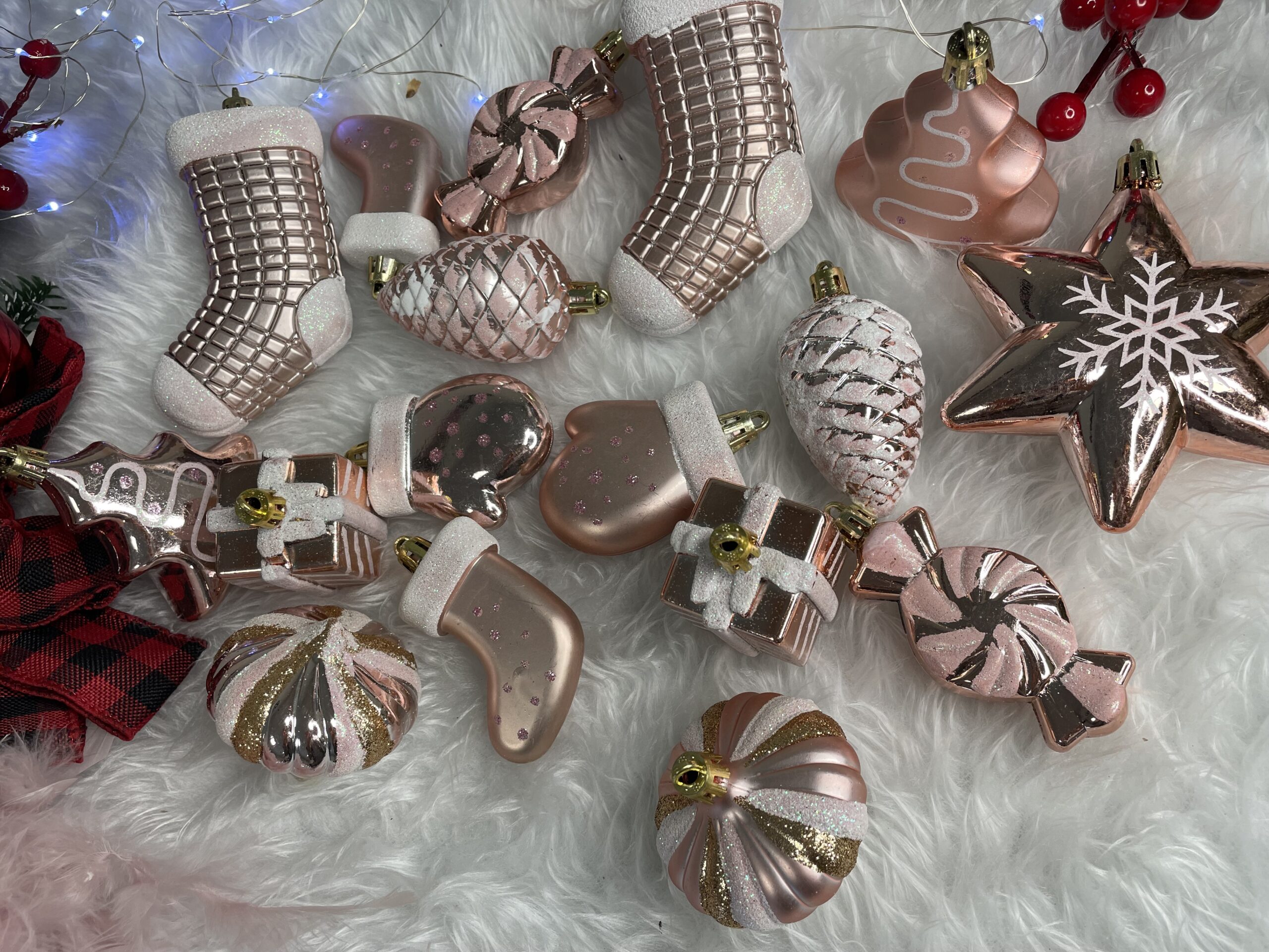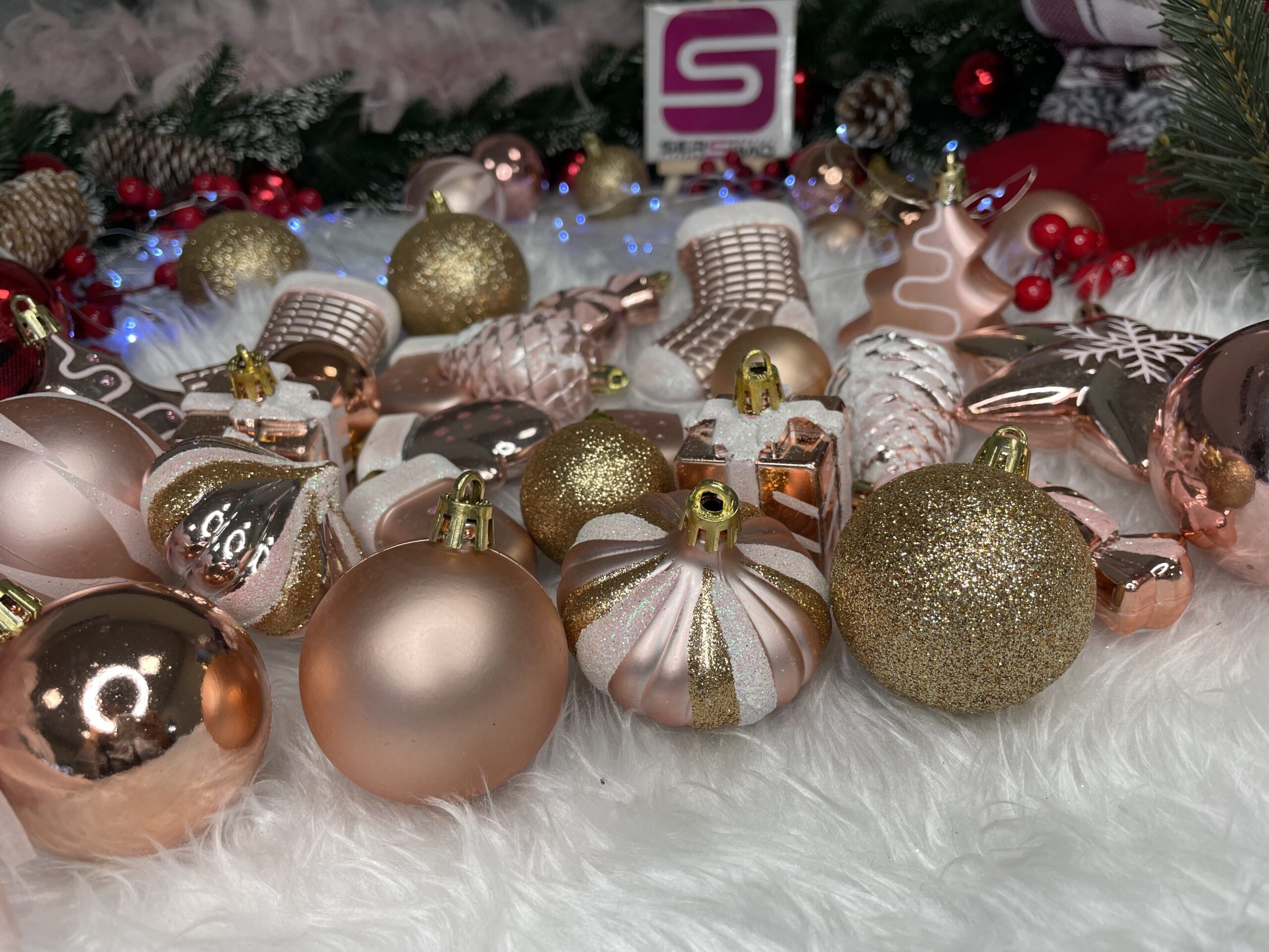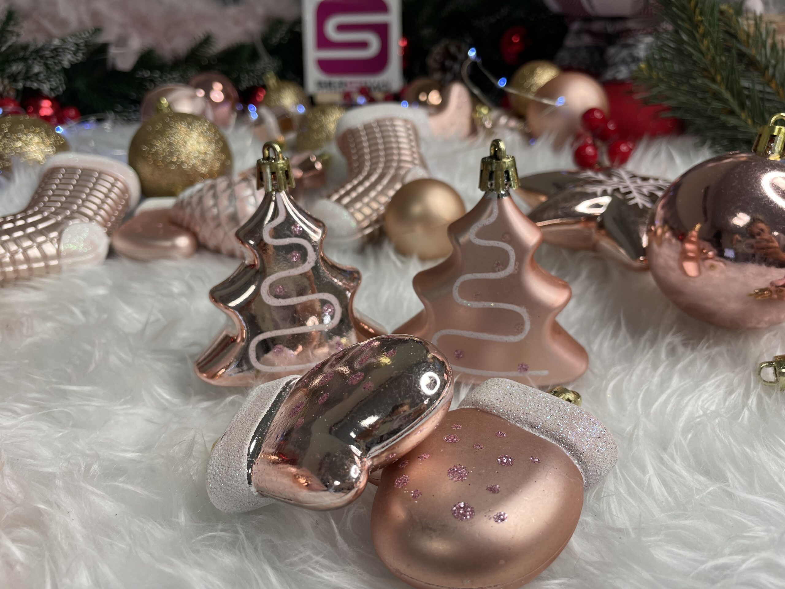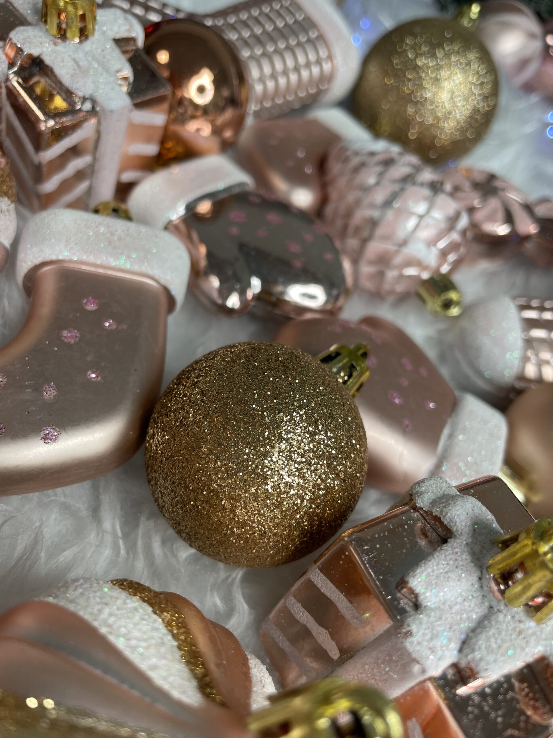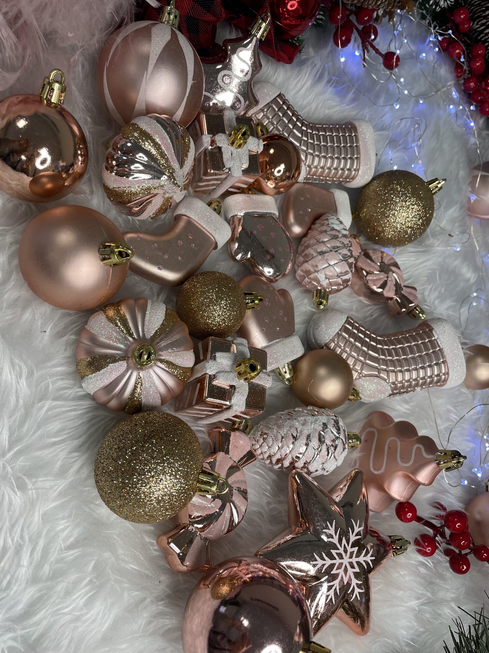 Set globuri si decoratiuni de Craciun, 77 piese, diverse dimensiuni, roz auriu Household NewTrend