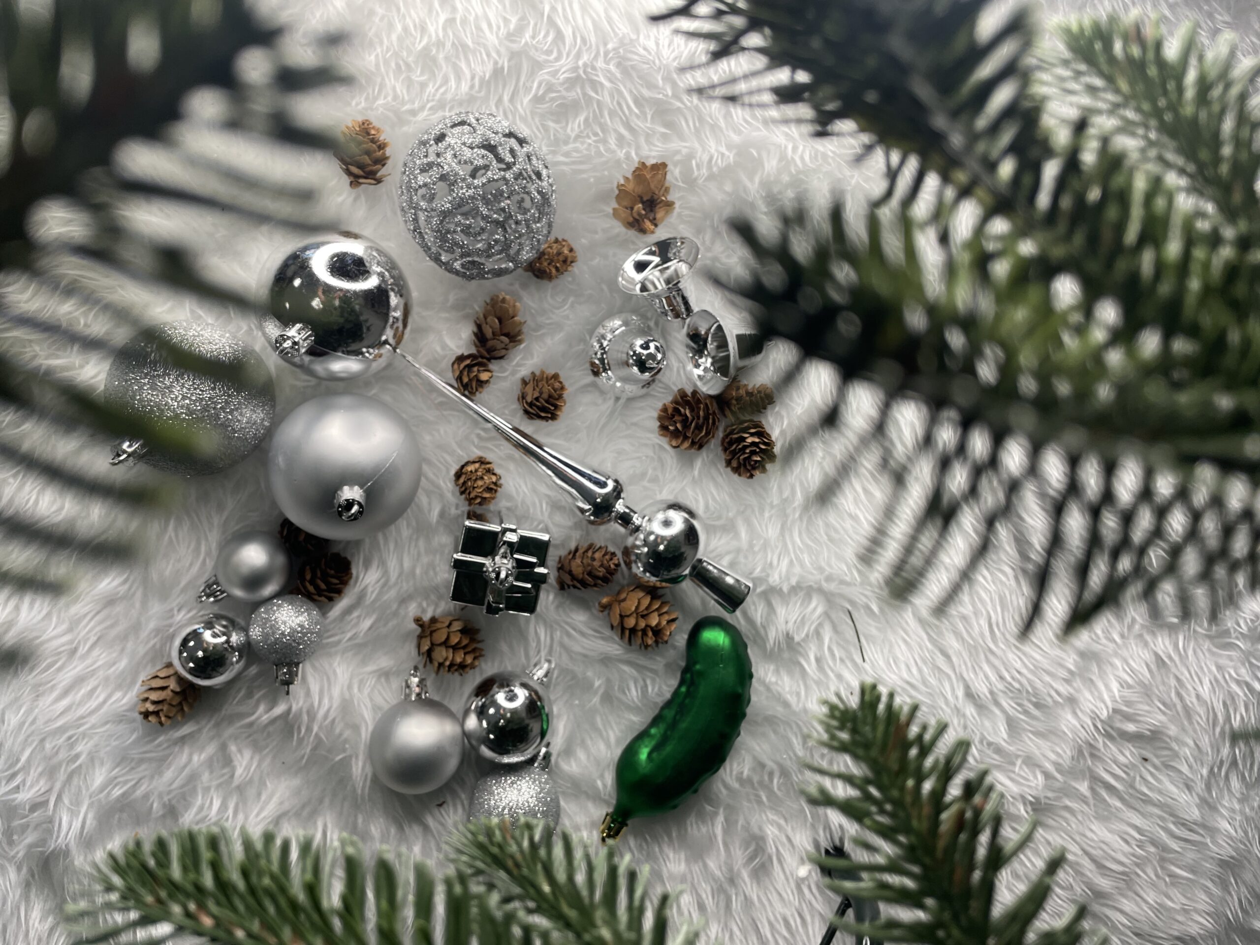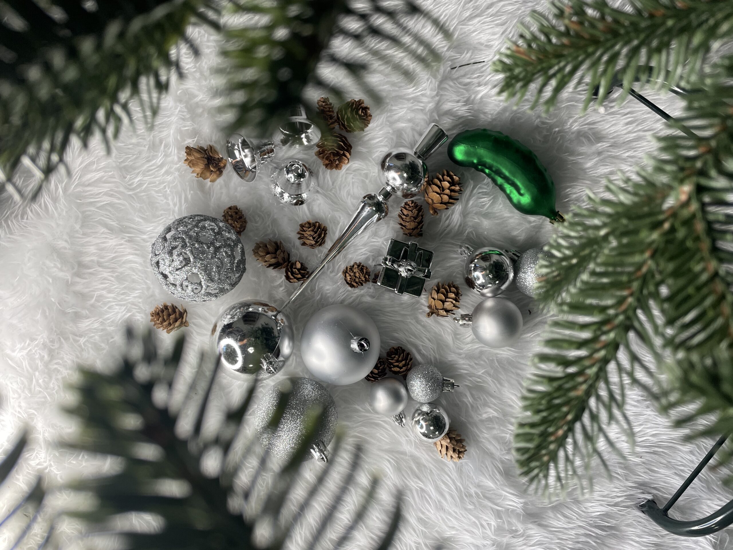 Set globuri si decoratiuni de Craciun argintii, 102 piese, modele diverse