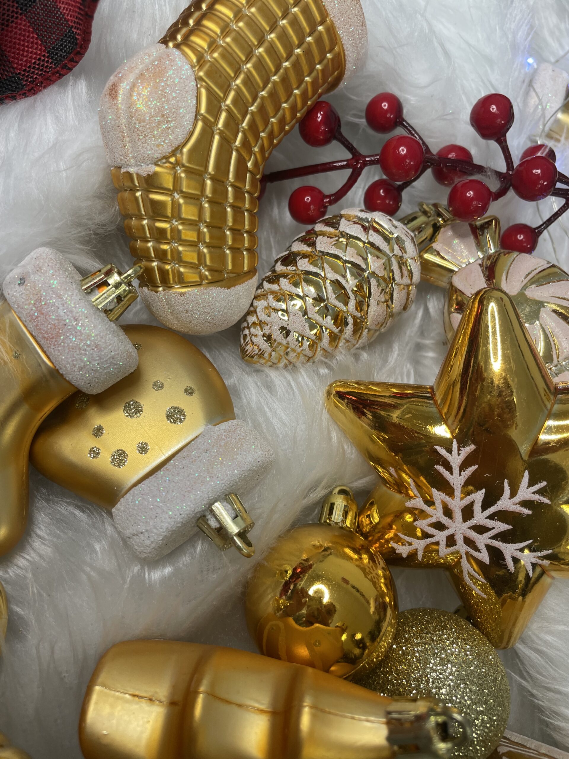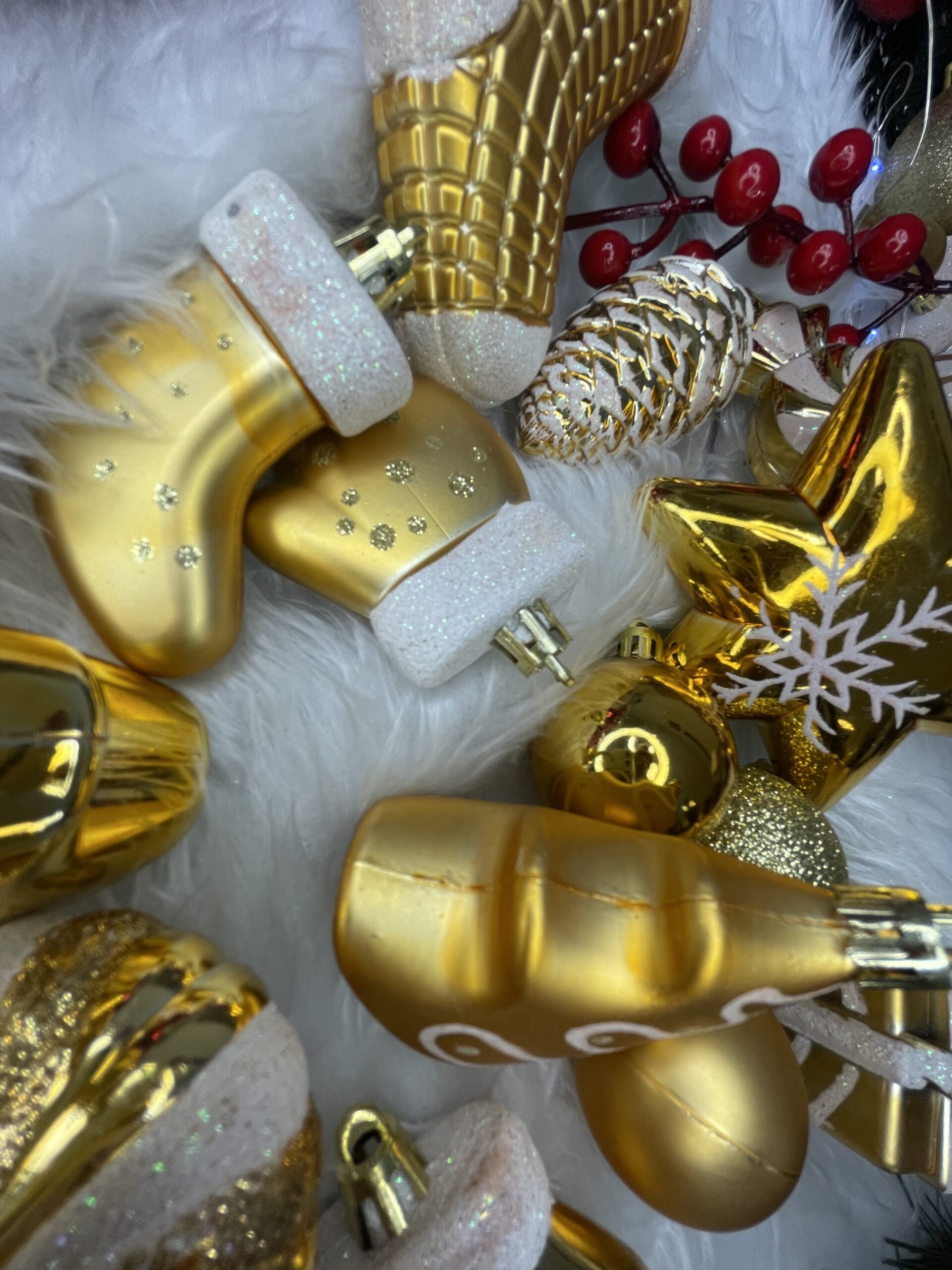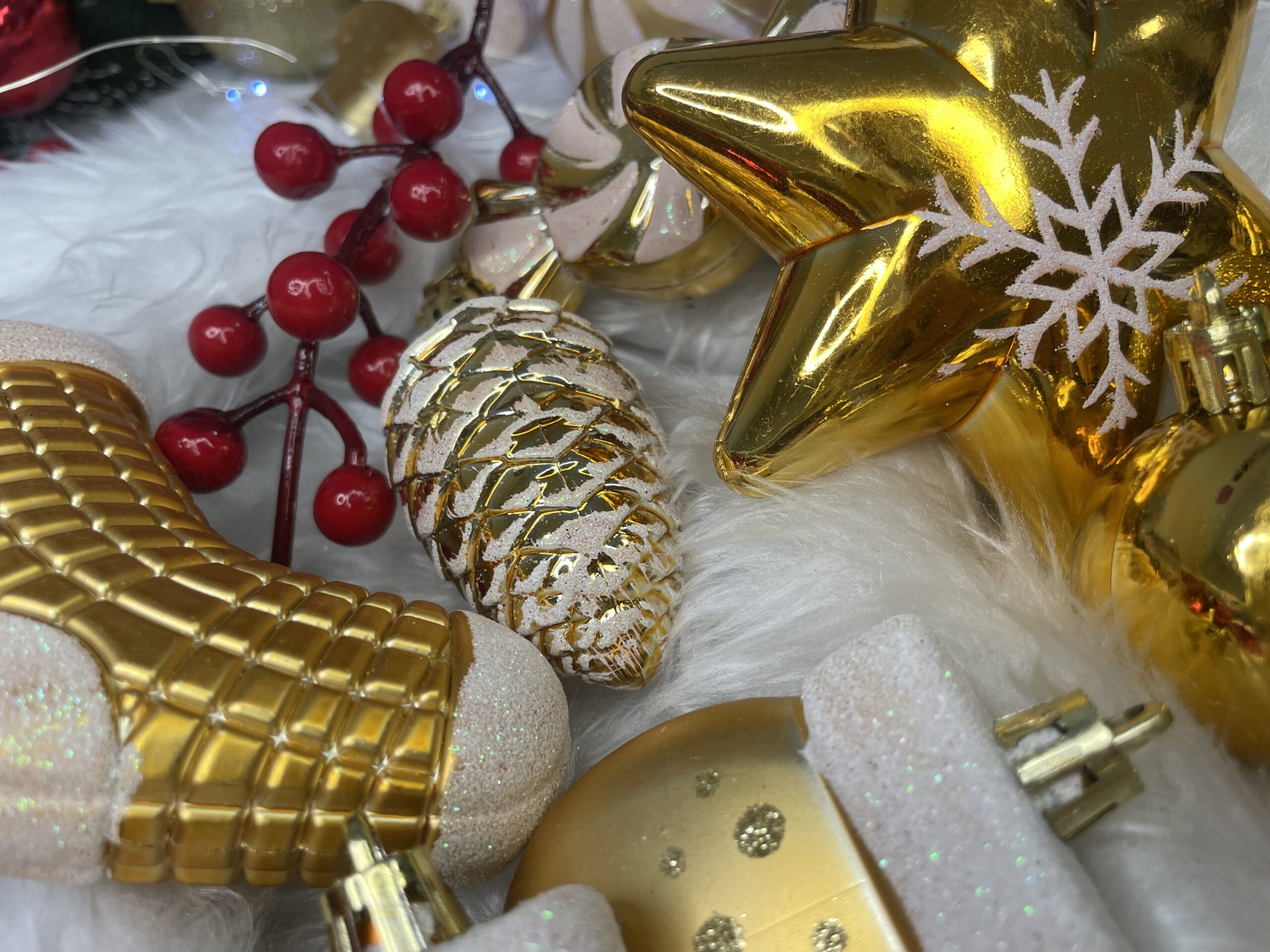 Set globuri si decoratiuni de Craciun aurii, 77 piese, diverse marimi