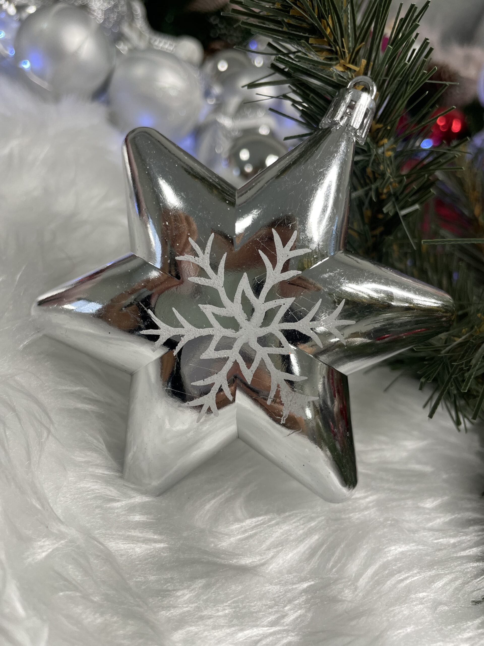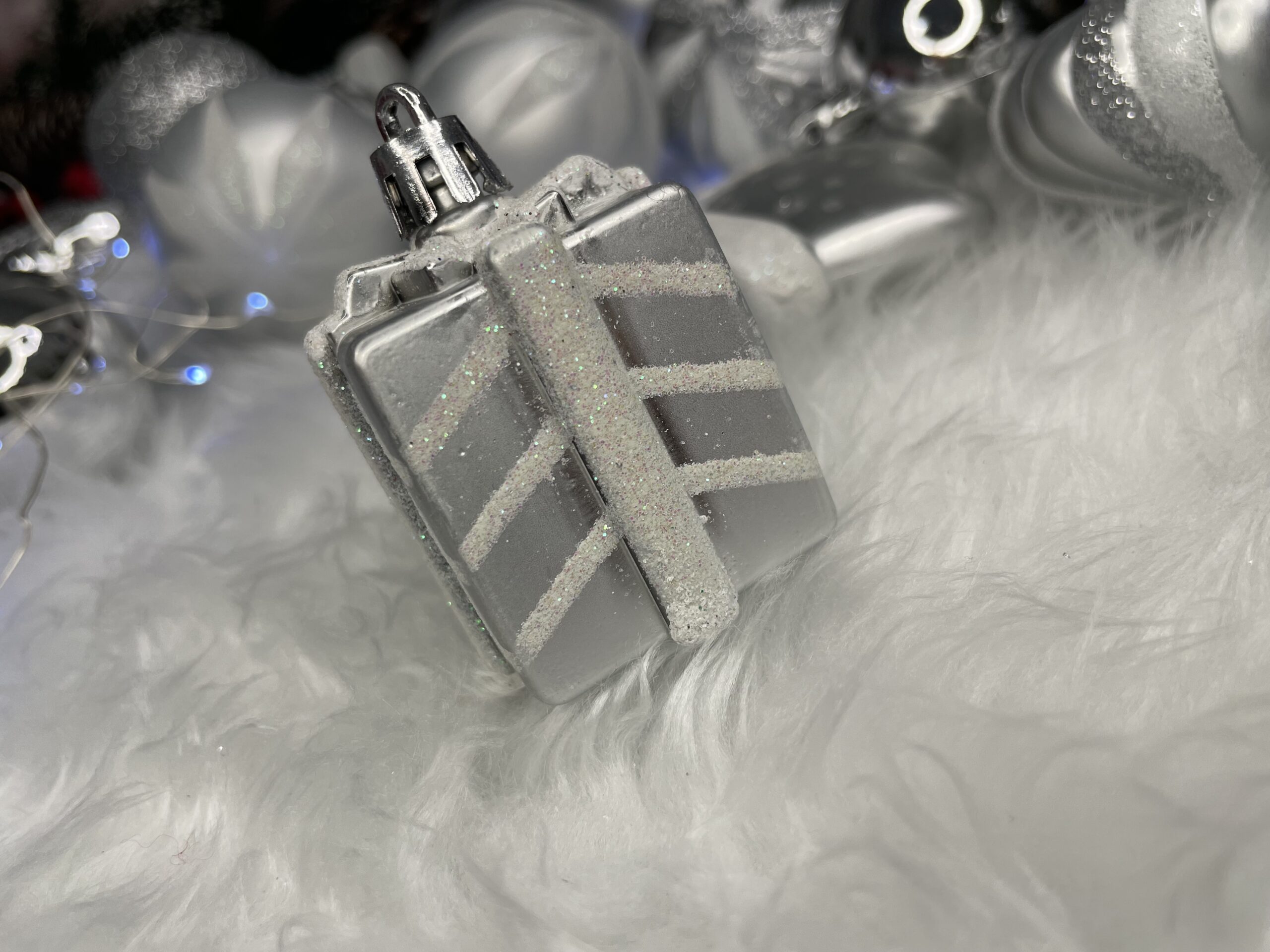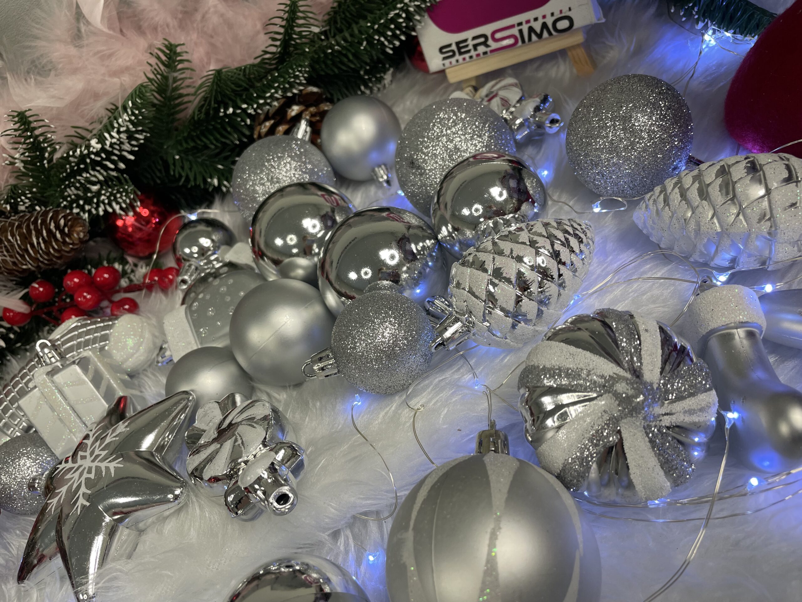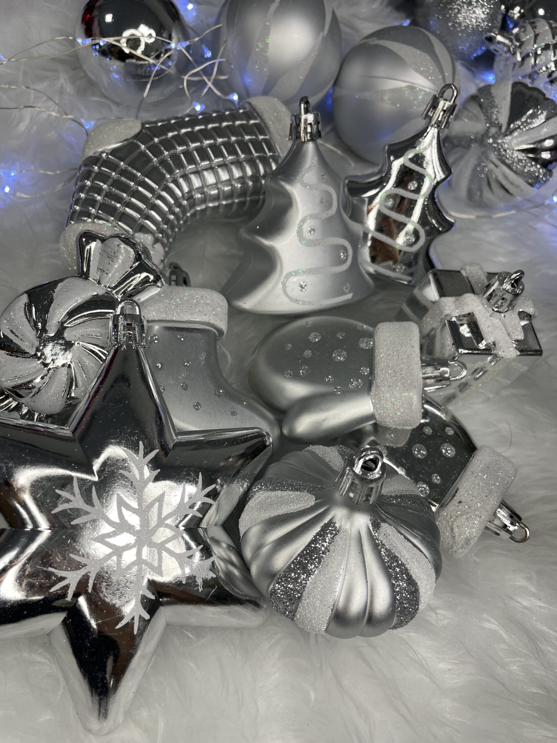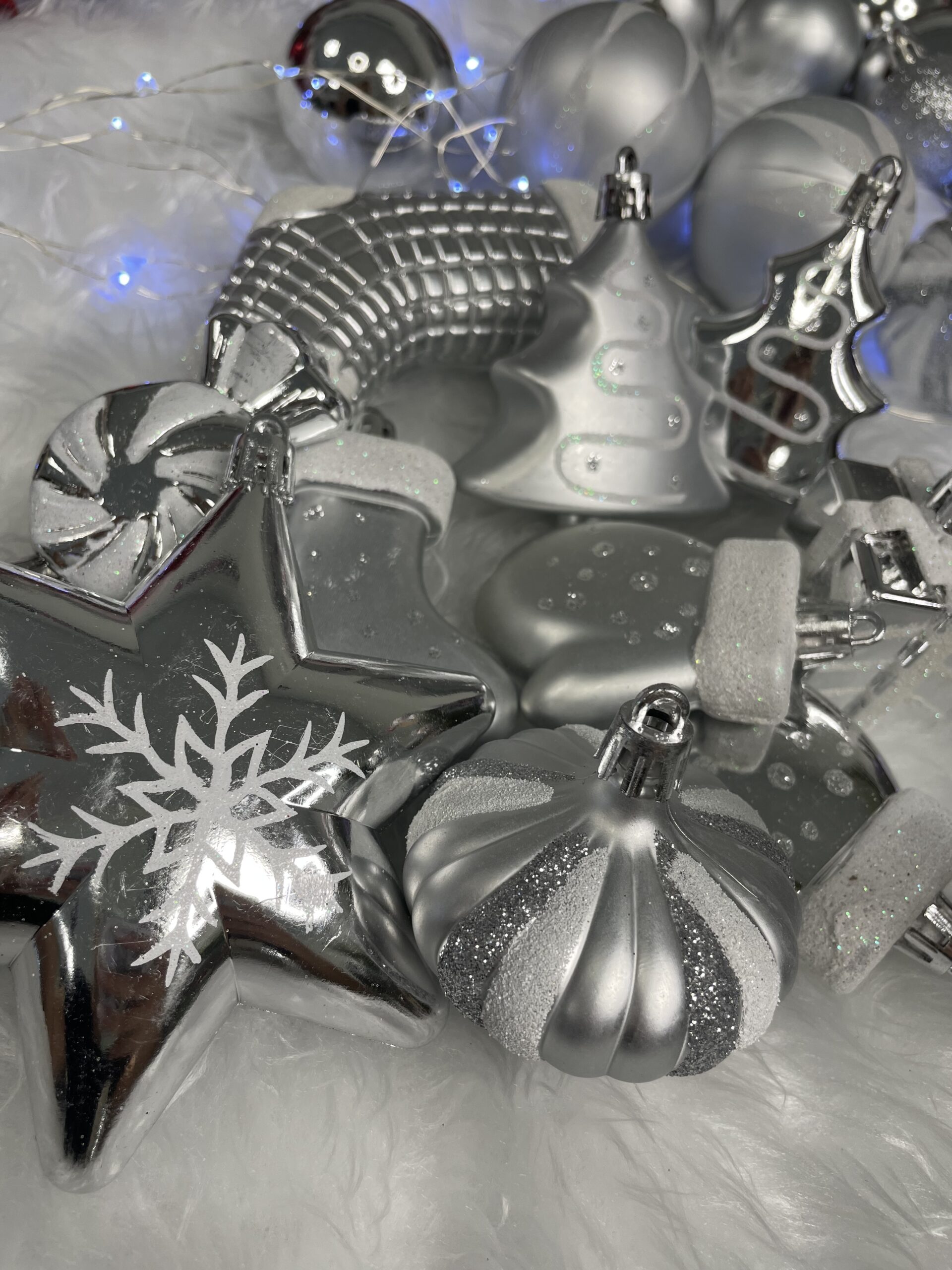Transforma bradul intr-un decor festiv elegant cu acest set globuri Craciun argintiu, format din 77 de piese in forme si dimensiuni variate. Nuanta argintie ofera un aspect rafinat, usor de integrat in decoruri moderne, clasice sau minimaliste. Realizate din plastic rezistent, decoratiunile sunt o alegere practica pentru familiile cu copii sau animale de companie, fiind mai sigure decat globurile din sticla.