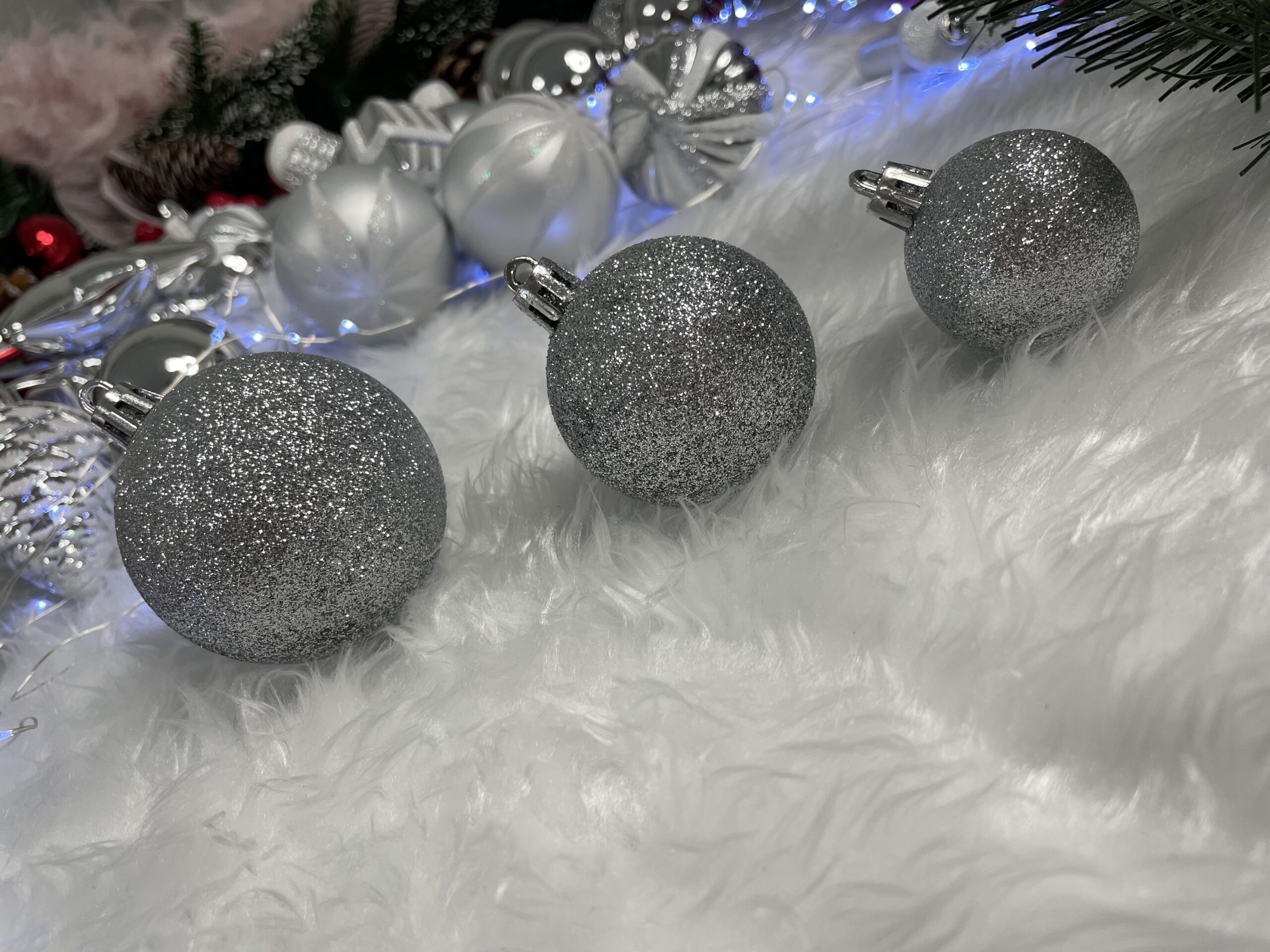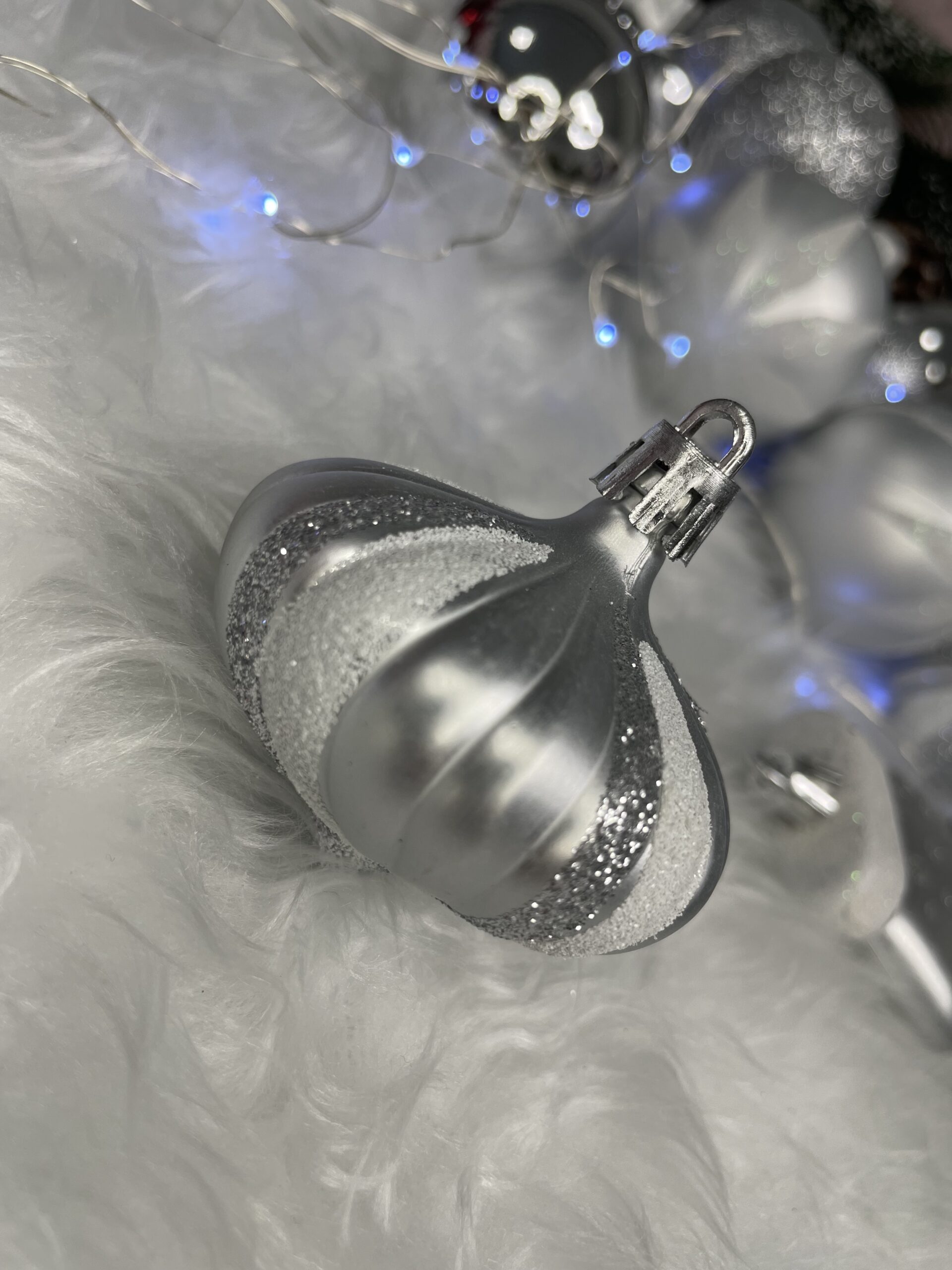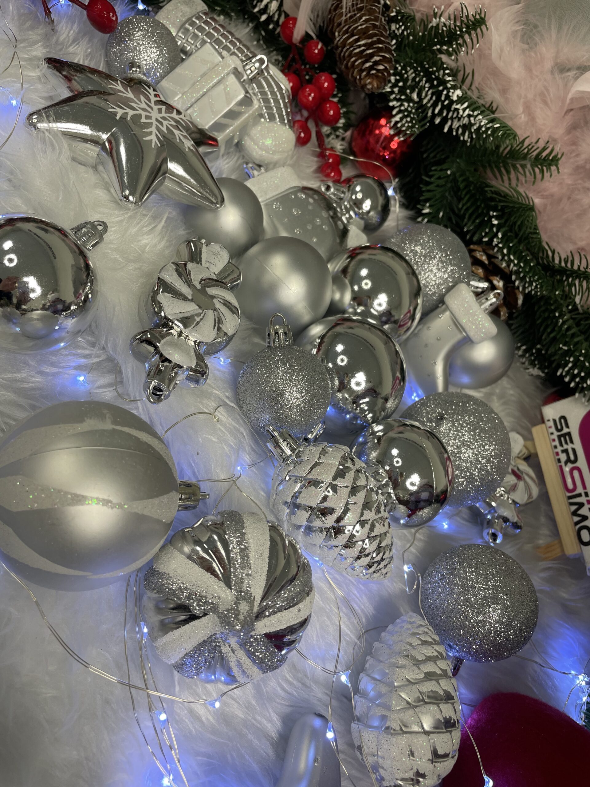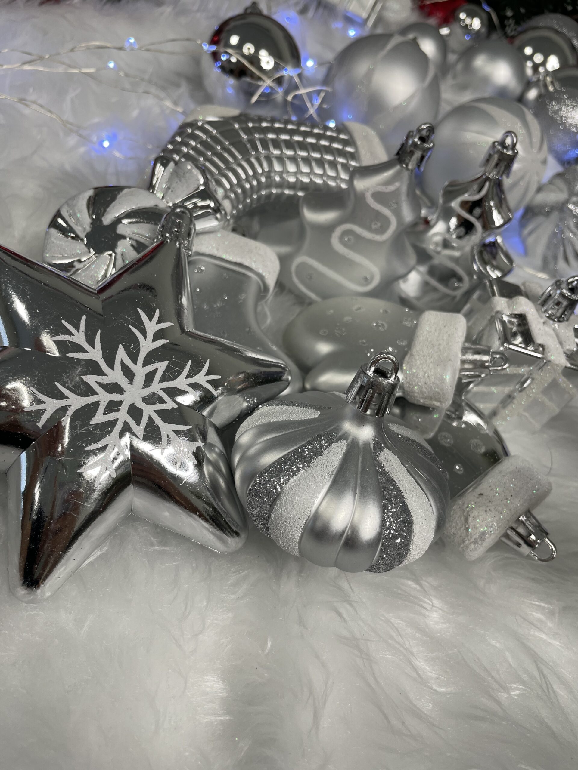 Set globuri si decoratiuni pentru bradul de Craciun, 77 piese, argintiu