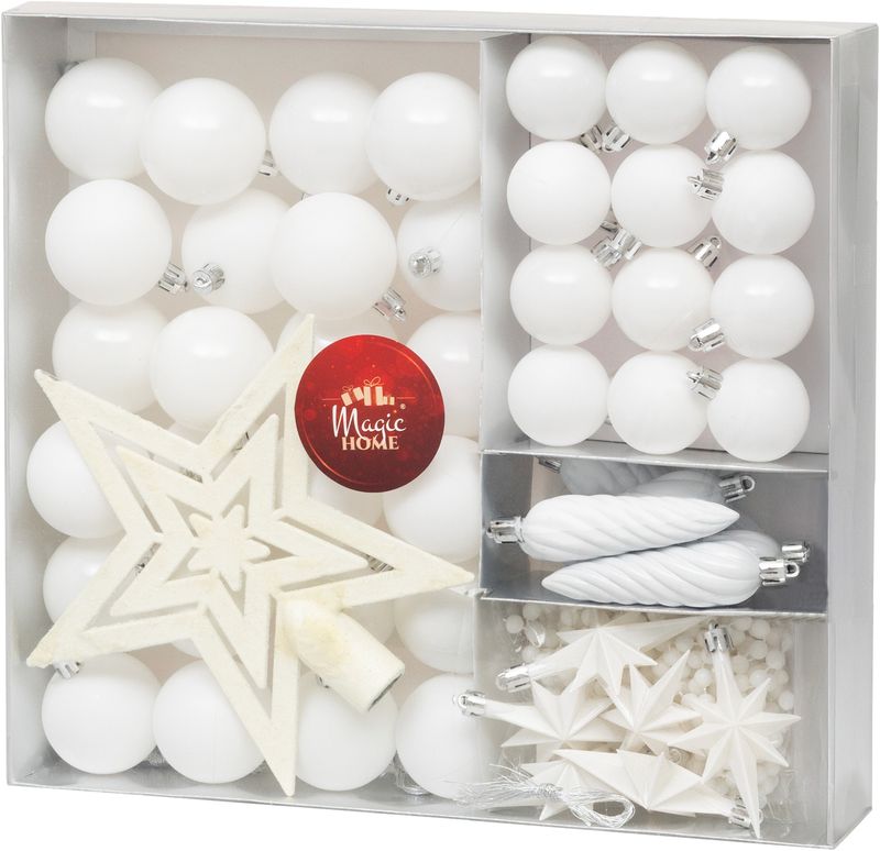 Set globuri si ornamente albe pentru brad, 50 piese, MagicHome