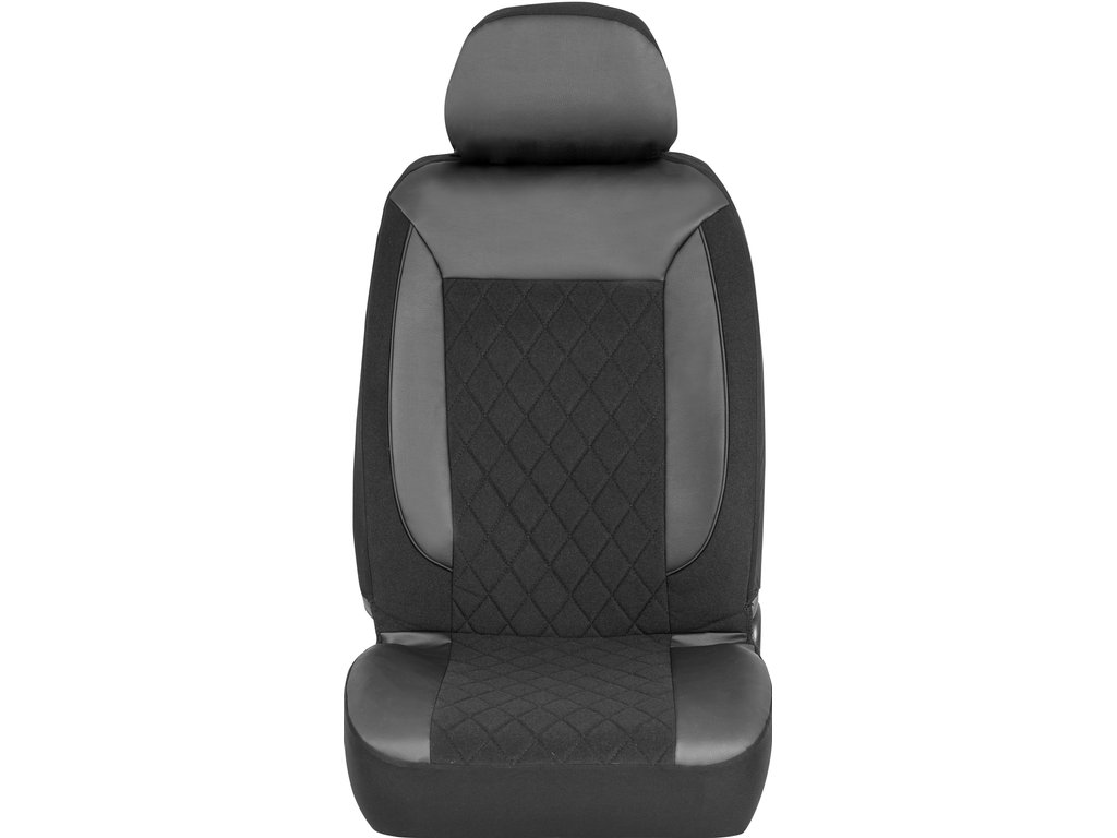 Husa de scaun neagra din poliester cu accente gri din PVC are un design frumos si robust, care se potriveste oricarui interior de masina.