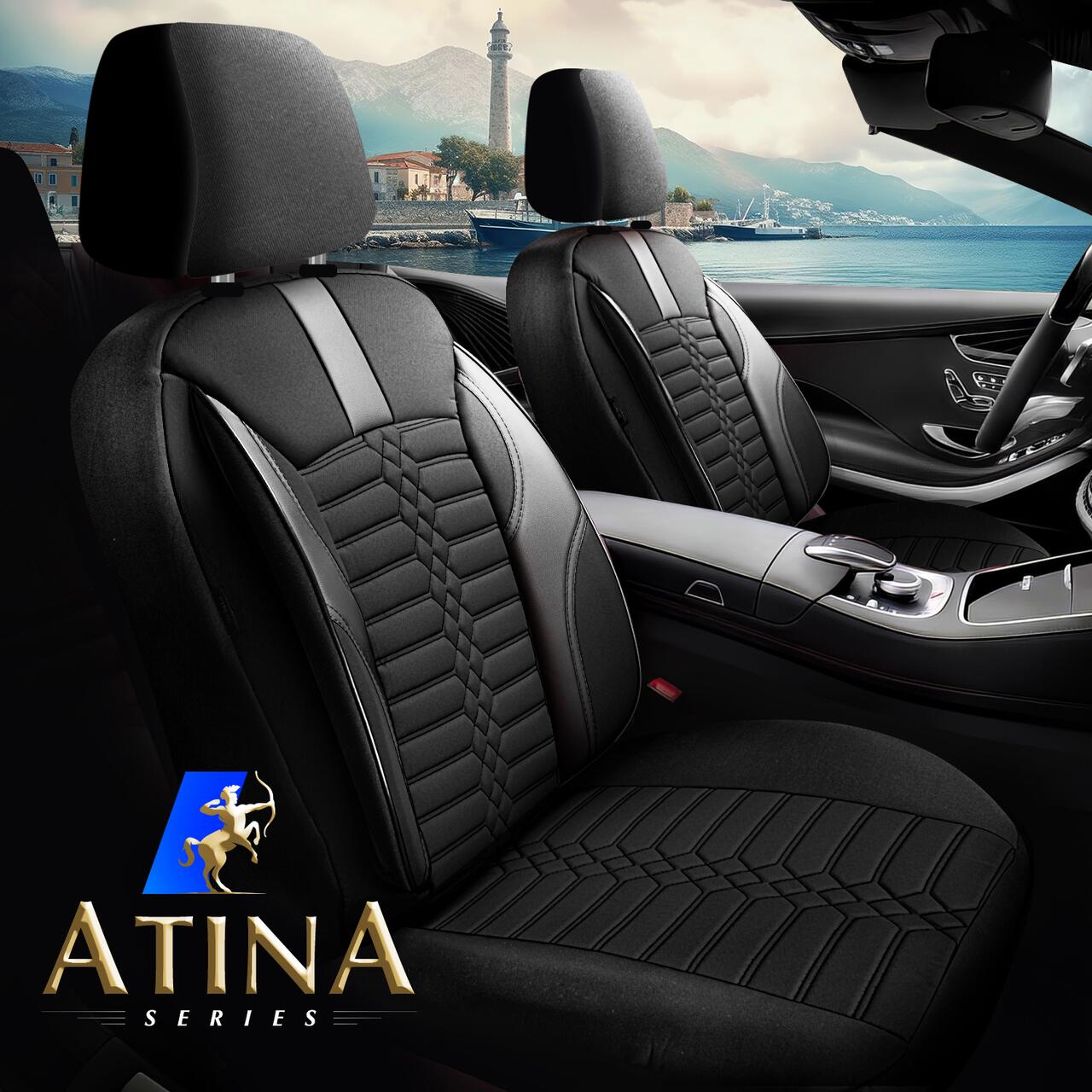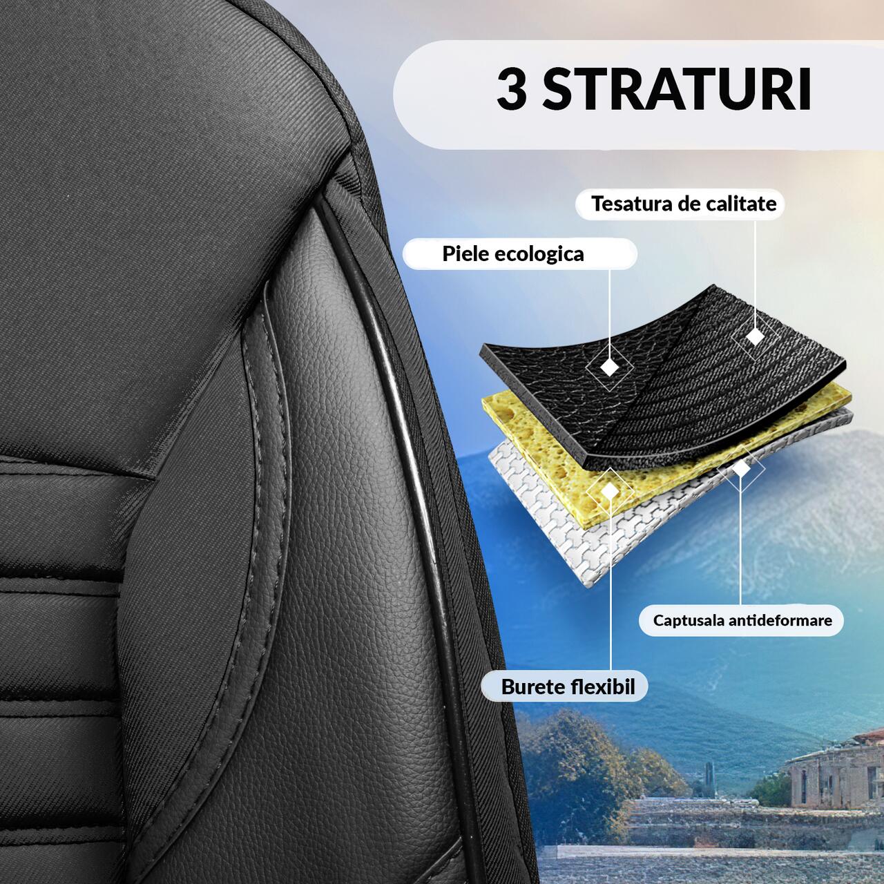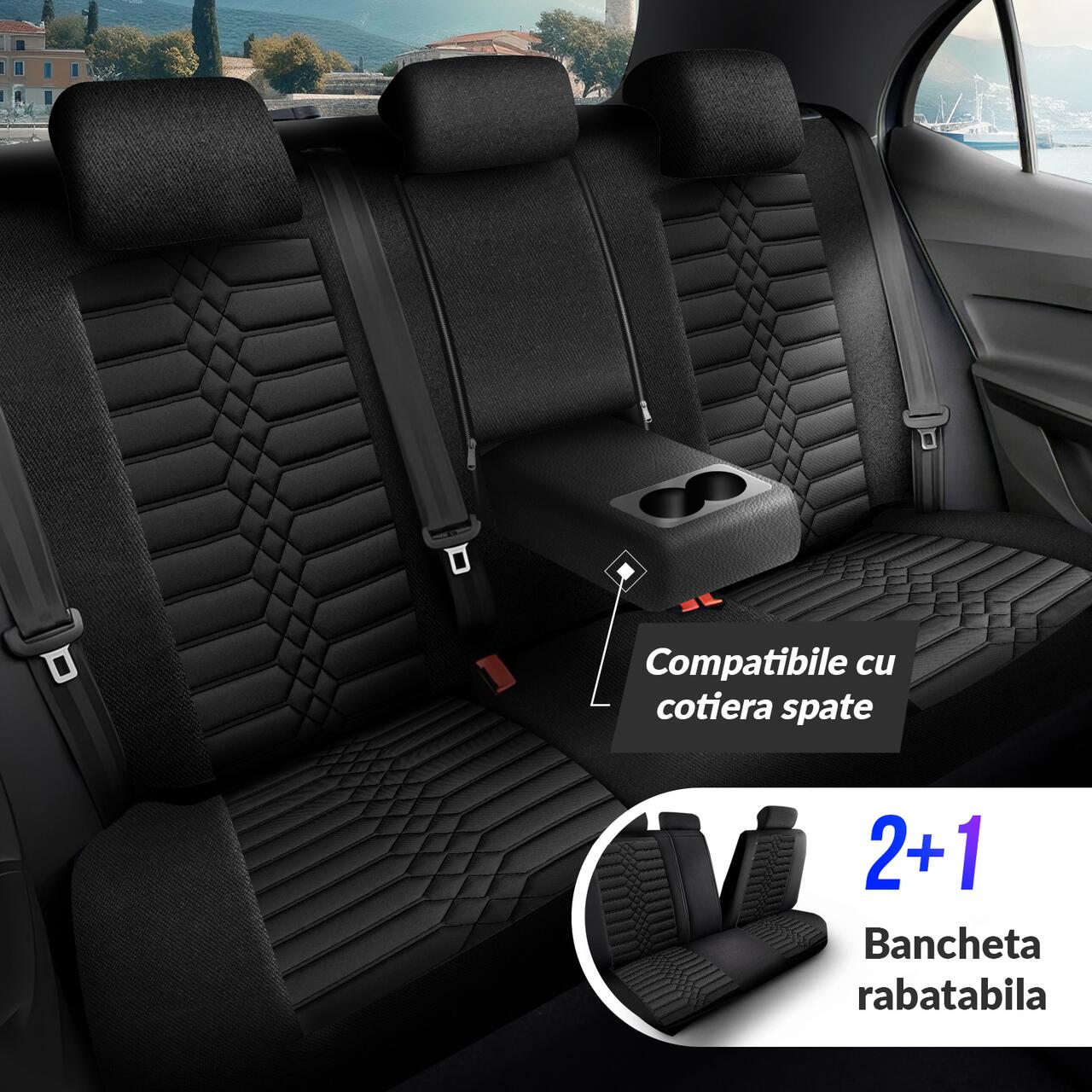 Set Huse Scaune Auto Panda Atena, material textil cu piele ecologica, cu fermoare pentru bancheta rabatabila, negru cu gri, 11 piese Automobile ProTravel