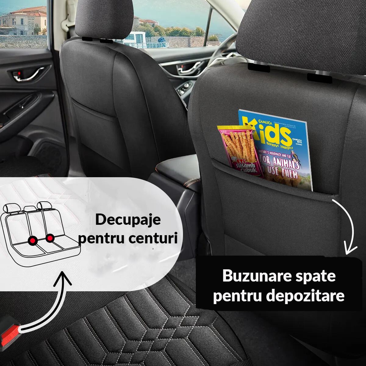 Husele de scaun se adapteaza perfect la talia si spatele conducatorului auto, asigurand confortul necesar in timpul conducerii. Husele scaunelor fata au spatare cu buzunare generoase de 22 x 27 cm, pentru a depozita diverse obiecte.