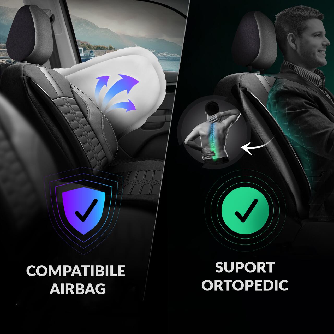 Husele pentru scaune PANDA sunt compatibile cu toate tipurile de autoturisme si au design ortopedic. Cusatura laterala este special conceputa pentru a permite deschiderea airbag-urilor laterale din scaune. Husa bancheta spate este compatibila cu elementele centurilor de siguranta.