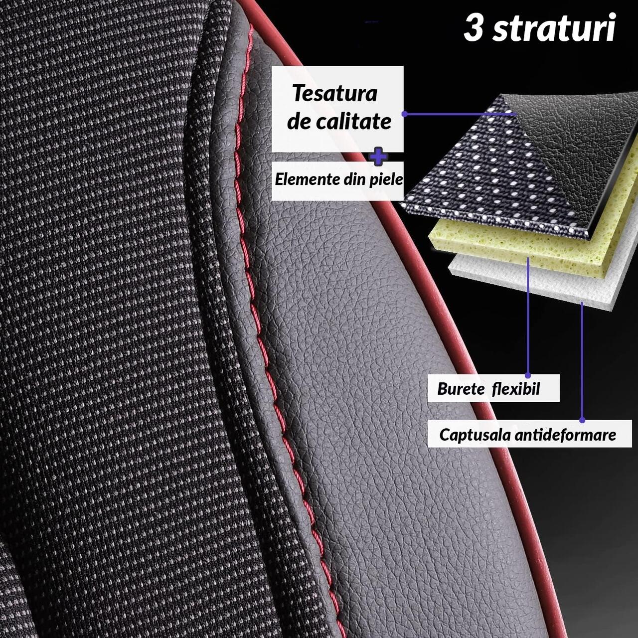 - Structura: 3 straturi - material textil, burete flexibil, captuseala antideformare