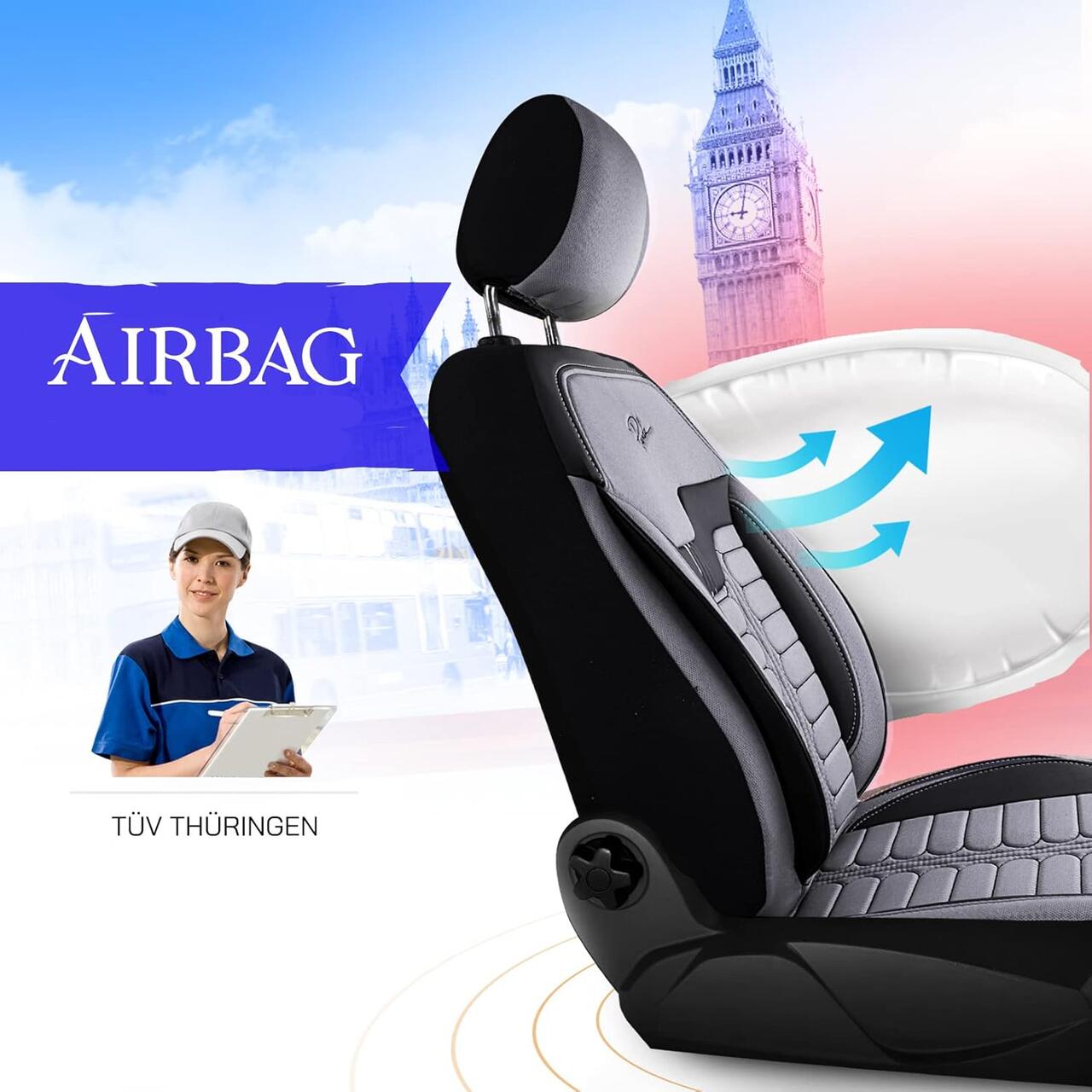 Setul se monteaza pe scaunele fata si bancheta spate pentru a proteja interiorul masinii si pentru a imbunatati aspectul habitaclului. Este potrivit pentru utilizare zilnica, atat in oras, cat si la drumuri lungi. Cusatura laterala este conceputa pentru a permite deschiderea airbag-urilor laterale, insa functionarea acestora poate depinde de mai multi factori specifici vehiculului si situatiei de impact.