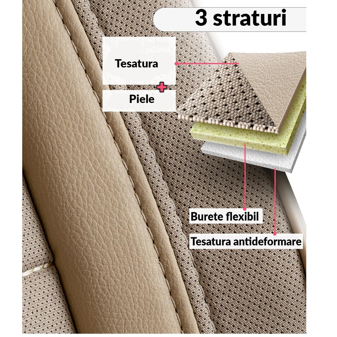 Materialele în 3 straturi contribuie la confort și rezistență în timp: strat textil cu aspect apropiat de tapițeria originală, burete flexibil și căptușeală antideformare. În plus, husele pentru scaunele față sunt prevăzute cu buzunare practice pe spătar, utile pentru depozitarea obiectelor mici.