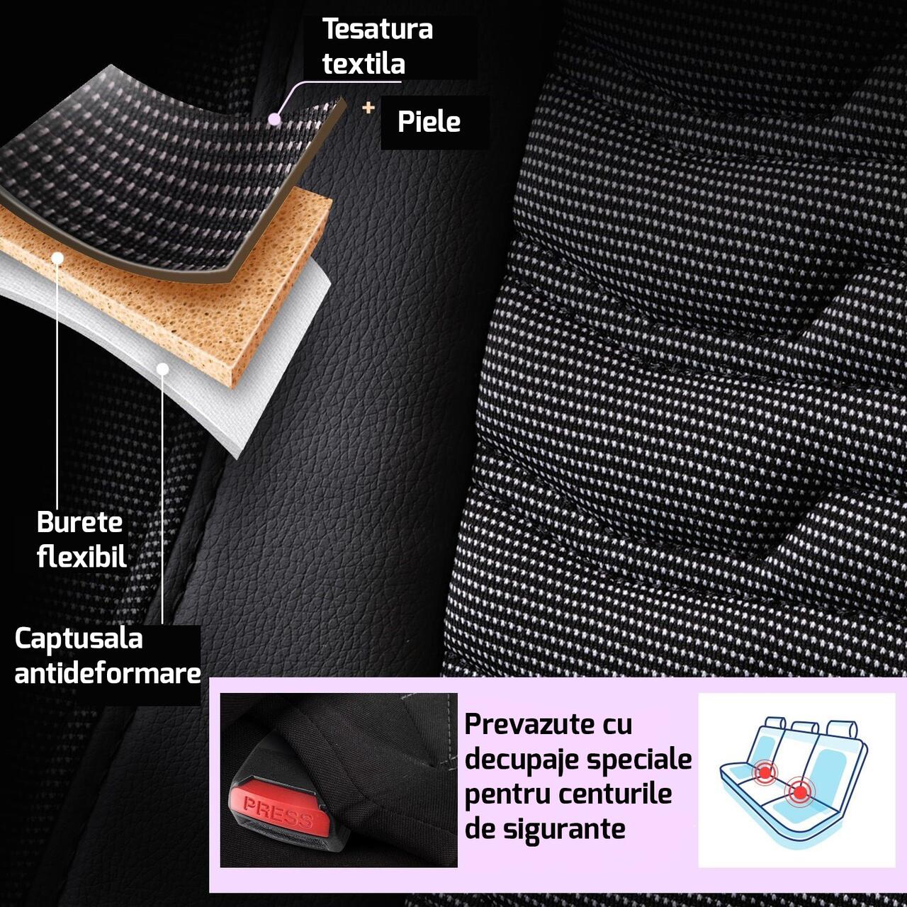 Husele pentru scaune PANDA sunt compatibile cu toate tipurile de autoturisme si au design ortopedic. Cusatura laterala este special conceputa pentru a permite deschiderea airbag-urilor laterale din scaune. Husa bancheta spate este compatibila cu elementele centurilor de siguranta.