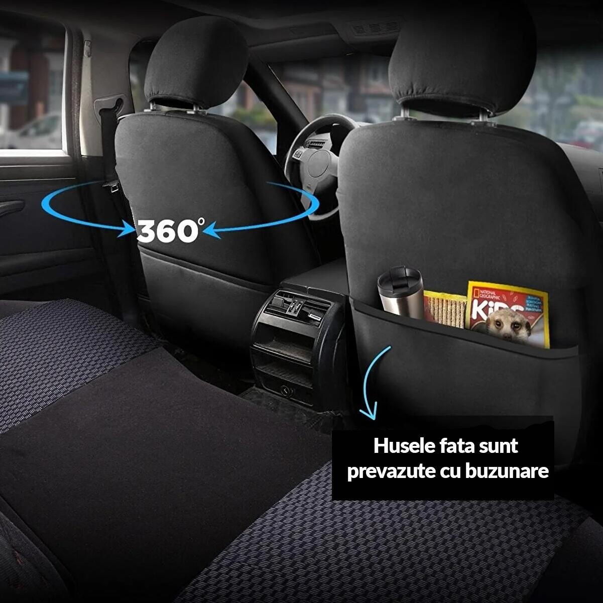 Husele sunt concepute pentru compatibilitate cu majoritatea tipurilor de autoturisme si sunt realizate din material textil + piele sintetica, pentru un echilibru bun intre aspect, durabilitate si intretinere usoara. Cusatura laterala este proiectata pentru a permite deschiderea airbag-urilor laterale din scaune, in functie de conditiile specifice de functionare ale vehiculului.