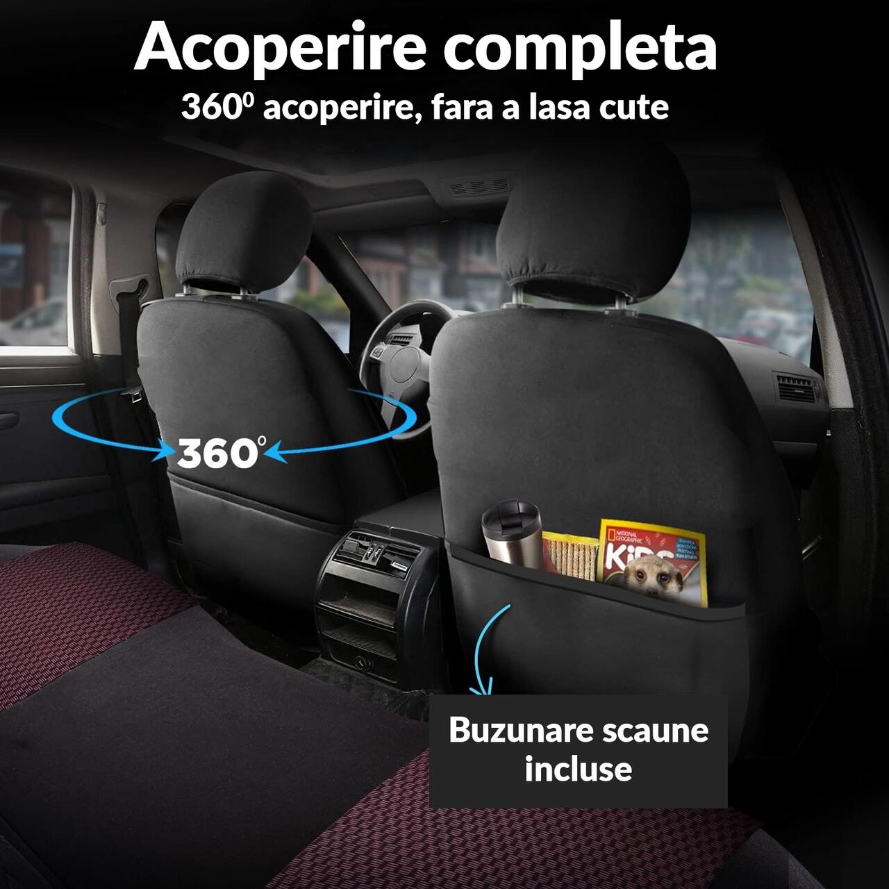 Continut: 2 huse pentru spatar fata, 2 huse pentru scaunul din fata, 1 husa pentru spatar spate, 1 husa pentru bancheta din spate, 5 huse pentru tetiere