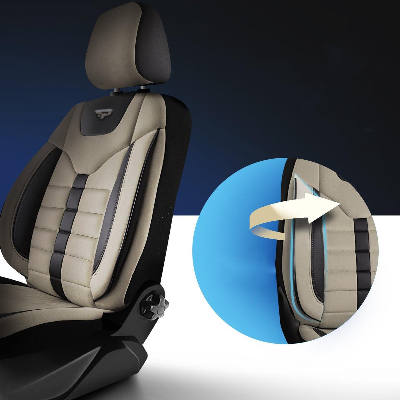 Setul este gandit pentru soferii care isi doresc protectie pentru scaune auto, un aspect ingrijit al habitaclului si o montare usoara. Cusaturile laterale sunt concepute pentru a permite deschiderea airbag-urilor laterale, iar bancheta spate este compatibila cu elementele centurilor de siguranta.