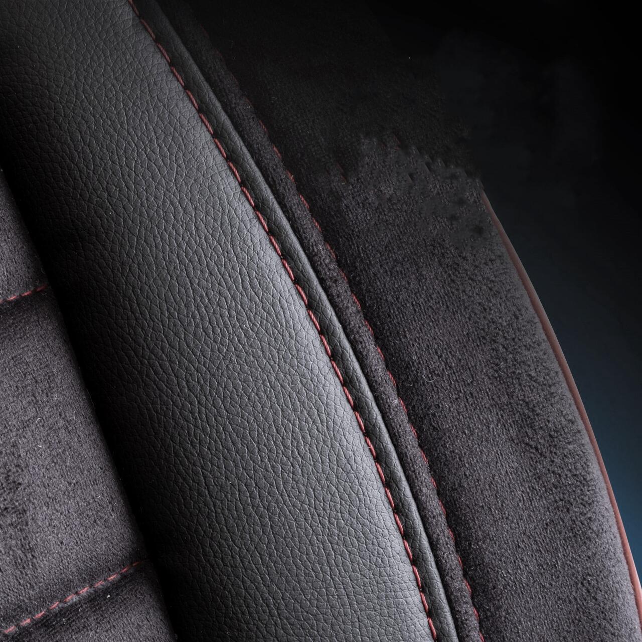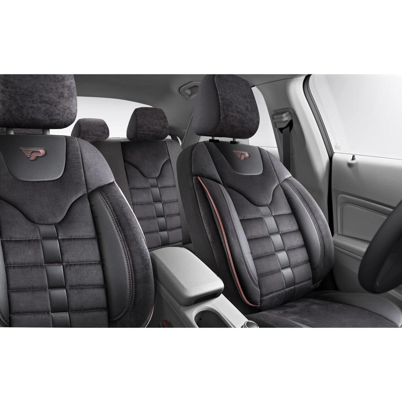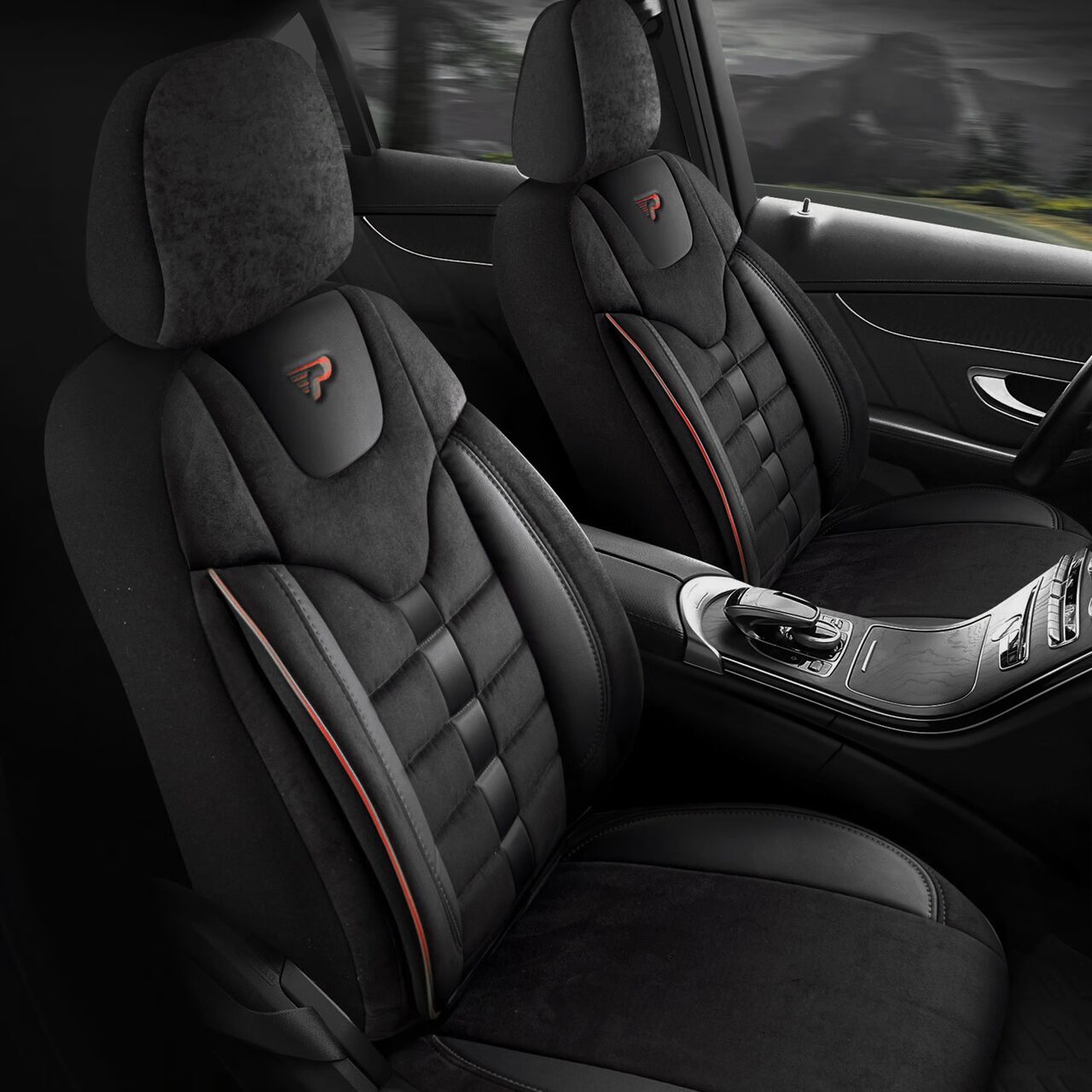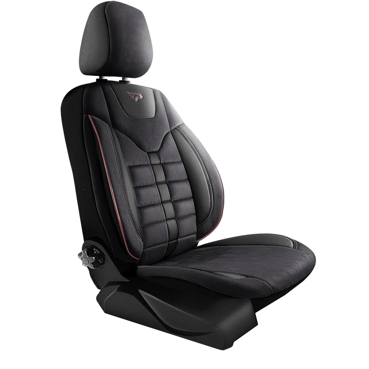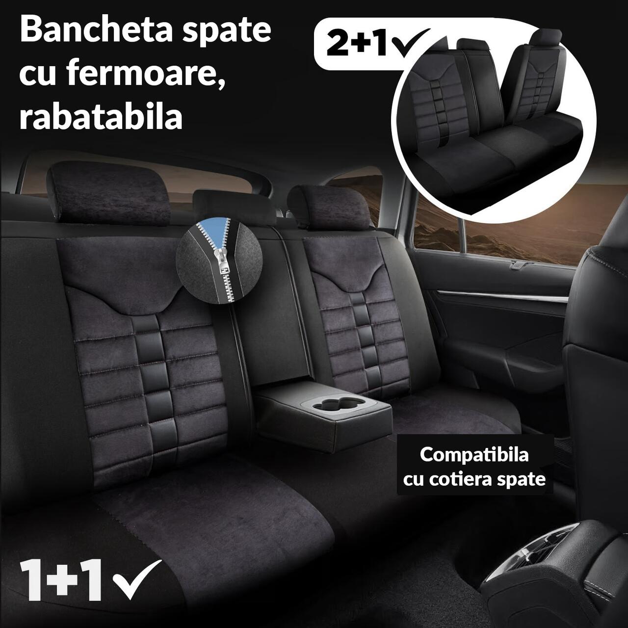 Set Huse Scaune Auto Panda Toronto, tip Alcantara, cu fermoare pentru bancheta rabatabila, negru cu cusatura rosie, 11 piese Automobile ProTravel
