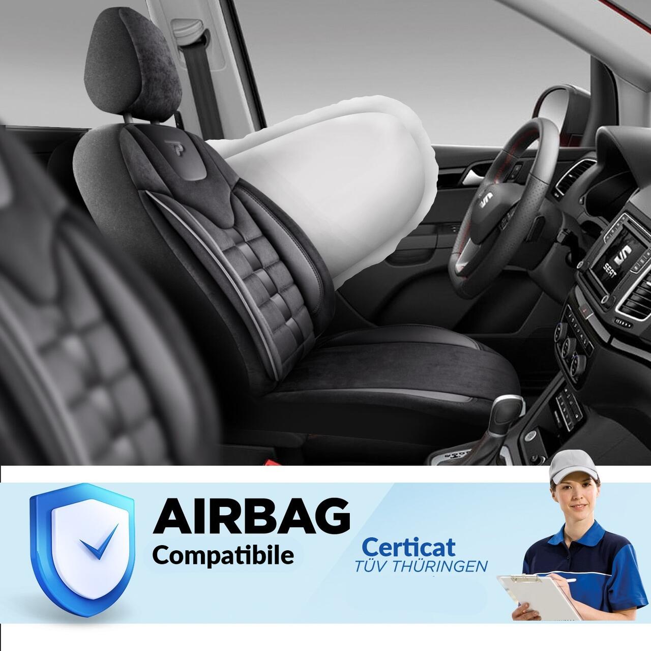 Husele pentru scaune PANDA sunt compatibile cu toate tipurile de autoturisme si au design ortopedic. Cusatura laterala este special conceputa pentru a permite deschiderea airbag-urilor laterale din scaune. Husa bancheta spate este compatibila cu elementele centurilor de siguranta.