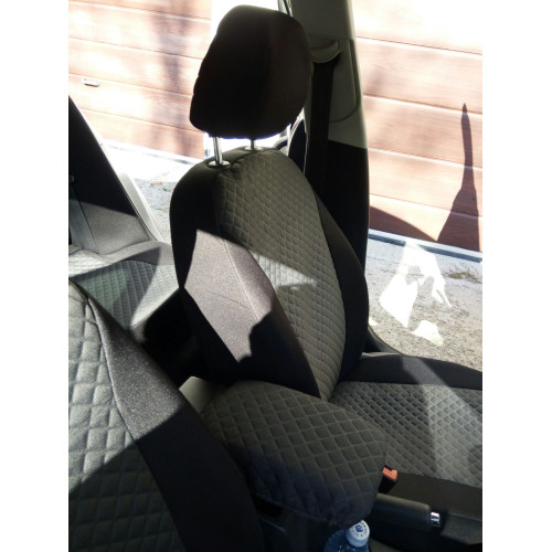 Important: aceasta varianta nu are decupaj pentru cotiera de la sofer si nu include husa de cotiera (pozele pot fi informative). Sezutul poate veni in nuante/texte diferite (inchis spre negru cu model), iar lateralele si spatele raman negre.