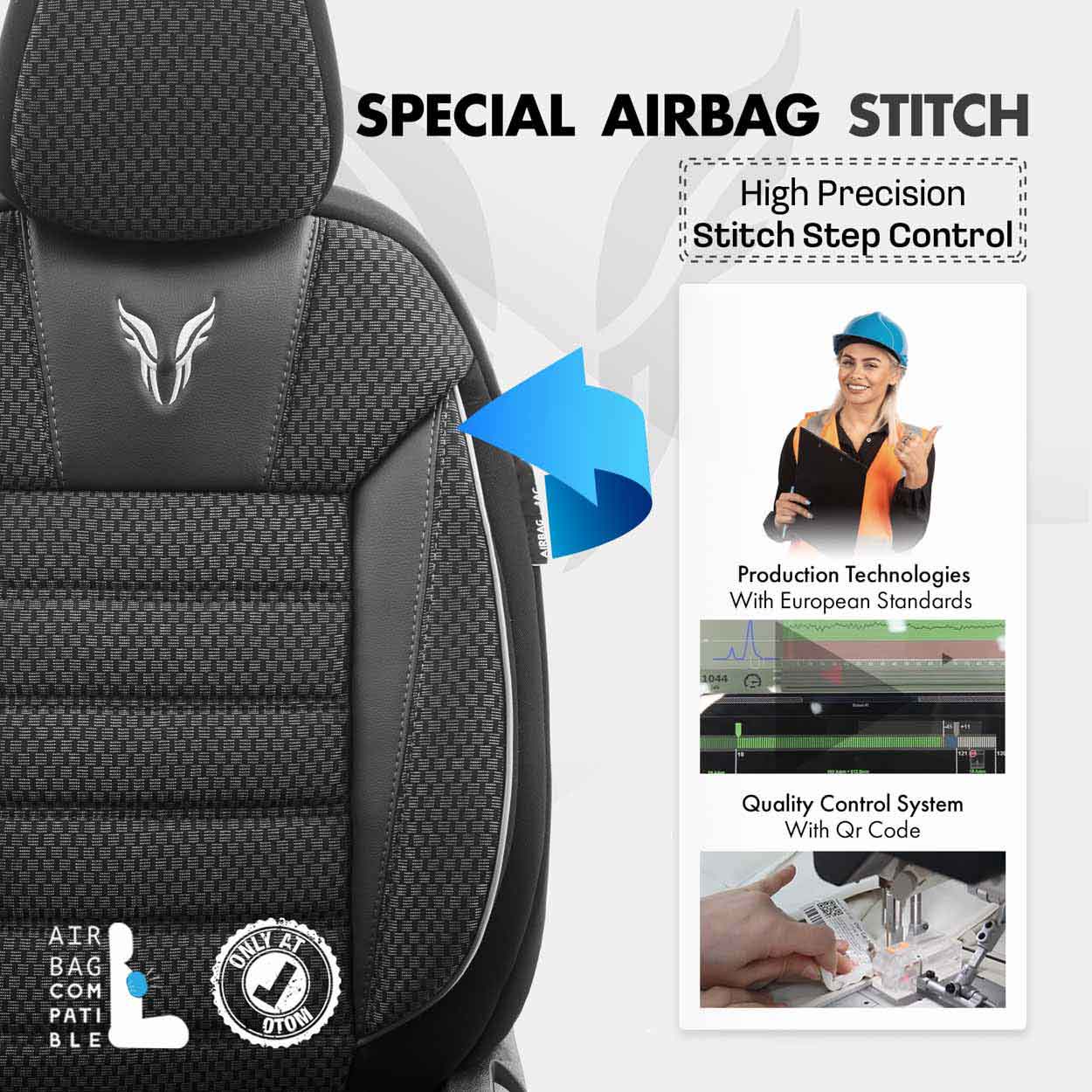 Acest set de huse pentru scaune auto reprezinta alegerea ideala pentru cei care doresc sa combine functionalitatea cu un design modern si atractiv. Pachetul complet ofera o protectie deplina pentru scaunele din fata, din spate, precum si pentru cele cinci tetiere, asigurand un look uniform si elegant pentru interiorul vehiculului dumneavoastra.