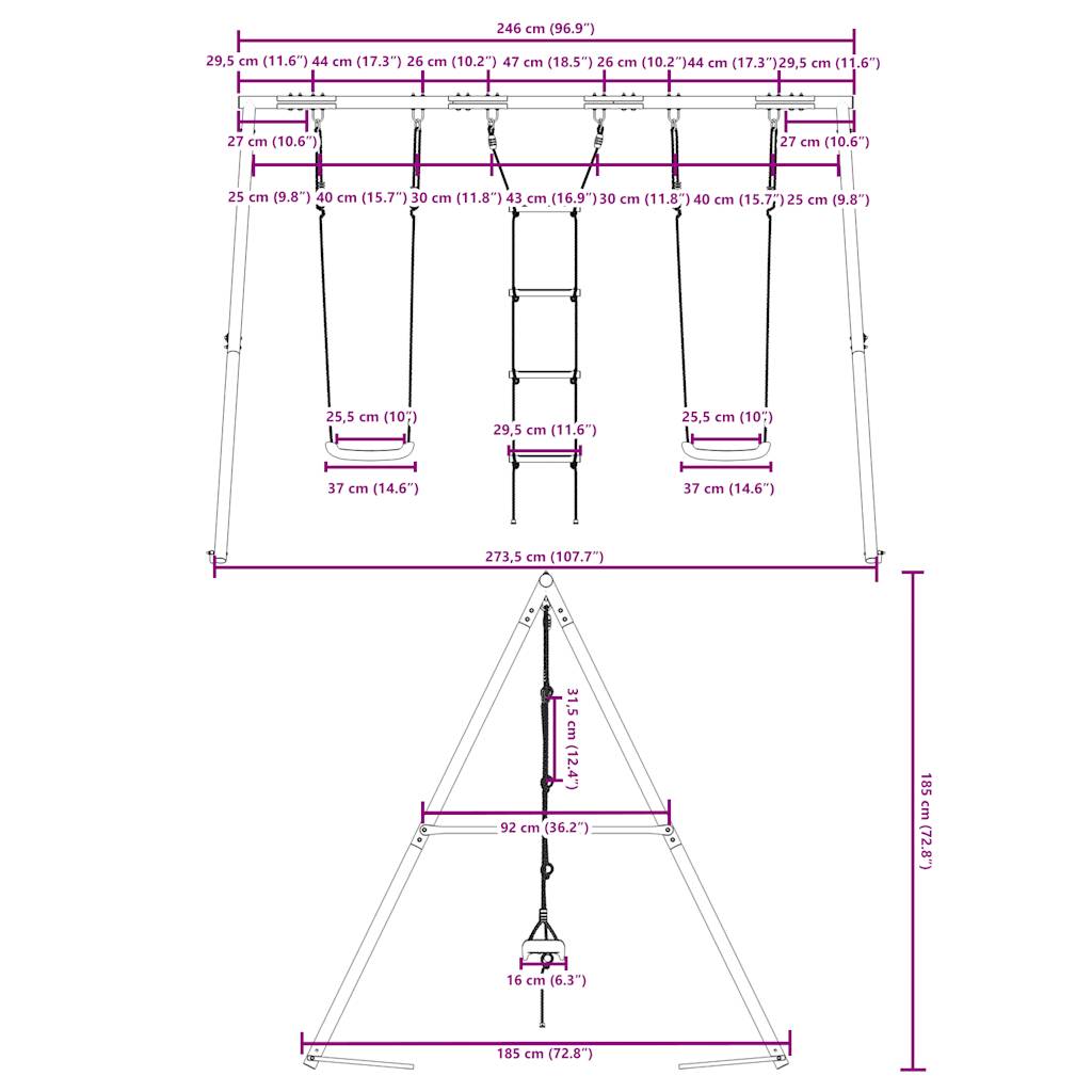 - Aplicații vaste: Acest cadru de leagăn poate fi plasat în diferite locații, cum ar fi în grădini, curți, pepiniere, locuri de joacă și multe altele.
