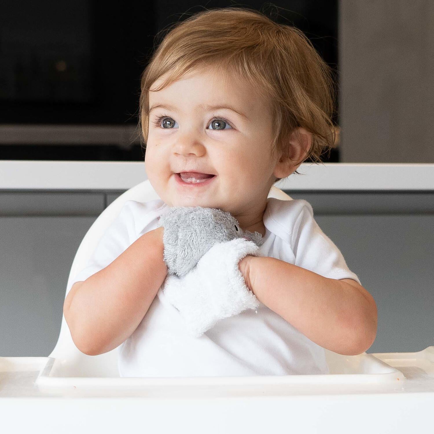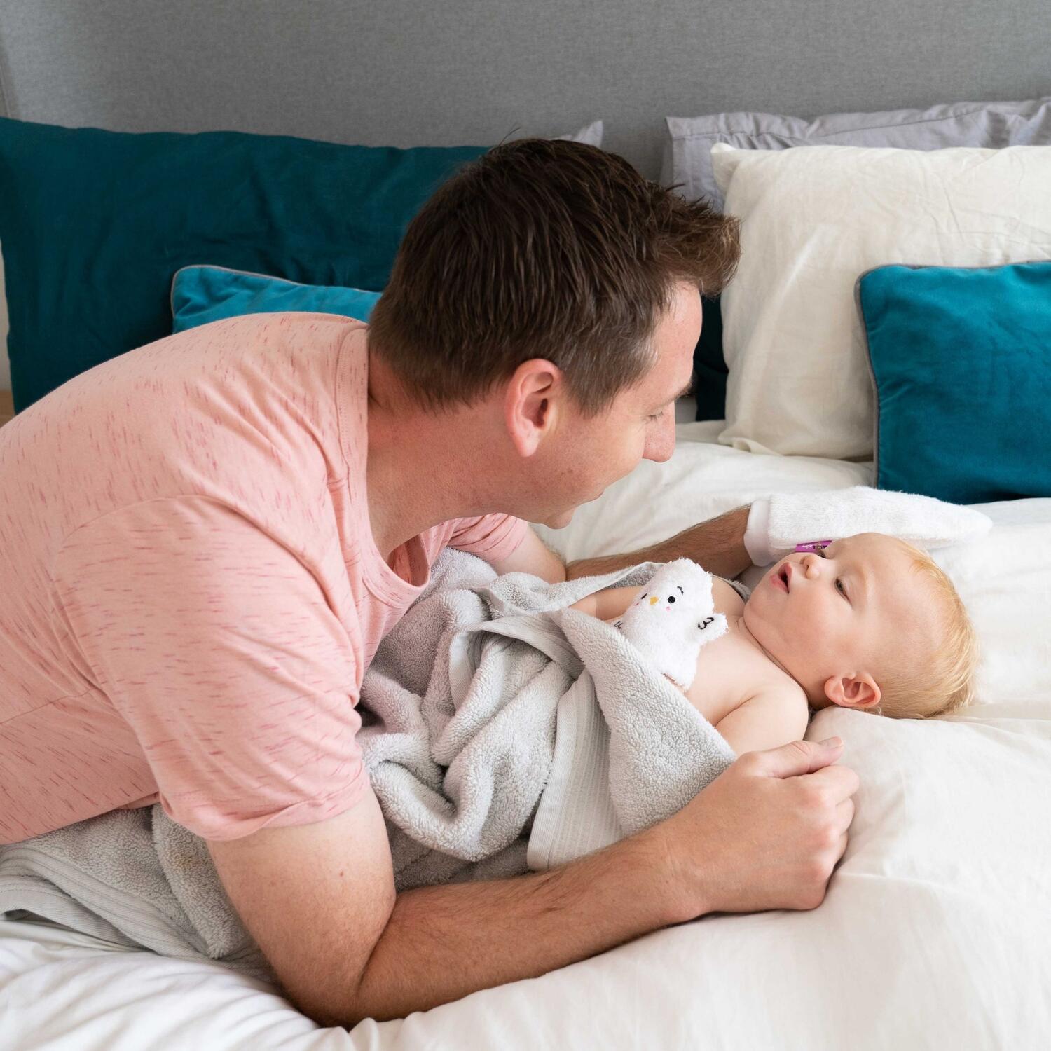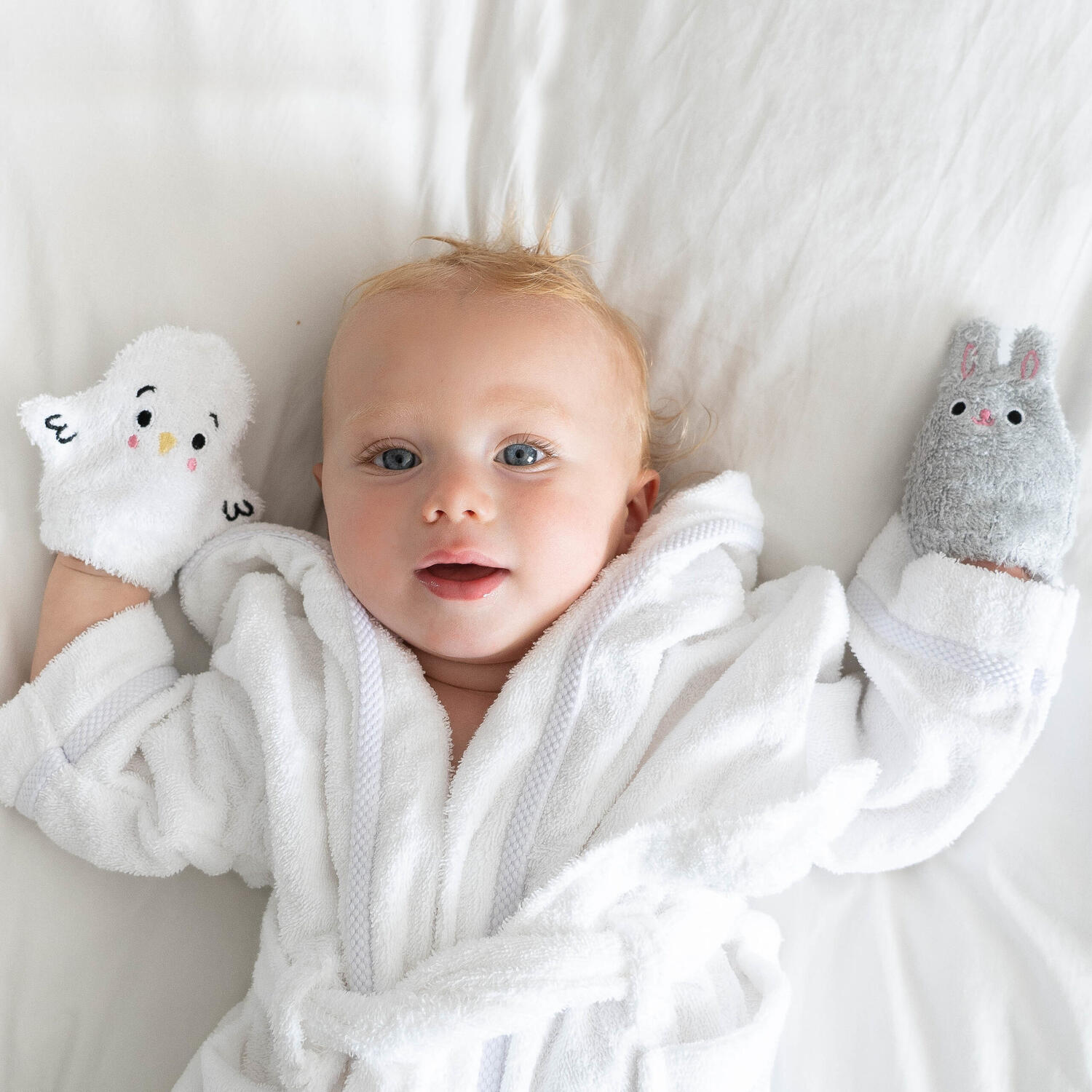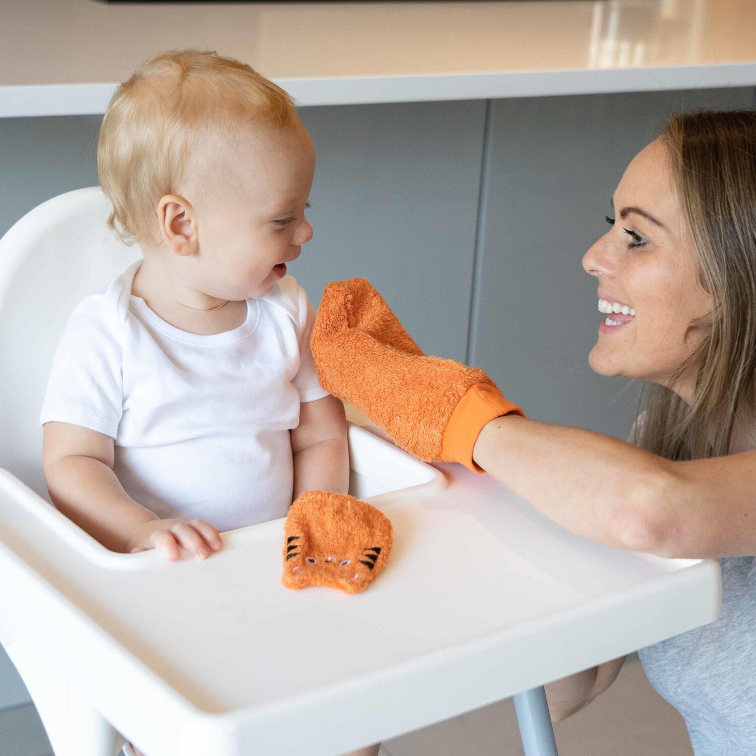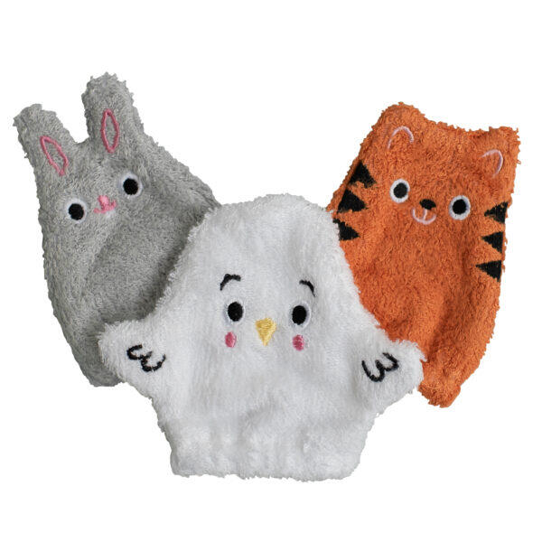 folositi manusile de marime adult pentru a sterge fata si mainile bebelusului sau pentru a-l spala in timpul baii, in timp ce acesta se joaca si imita miscarile cu propria sa manusa de bebelus