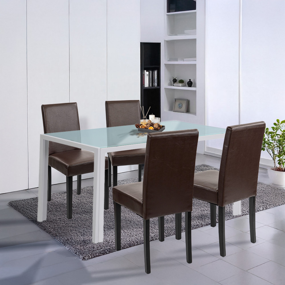 Creează un colț de luat masa primitor, ideal pentru apartamente din România sau spații de tip HoReCa. Setul de masă Leziter Mira include o masă cu blat din sticlă securizată și 4 scaune confortabile, într-o combinație alb-maro ușor de integrat în decoruri moderne.