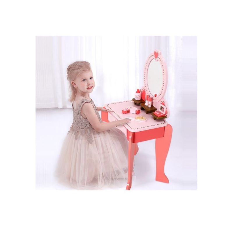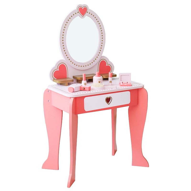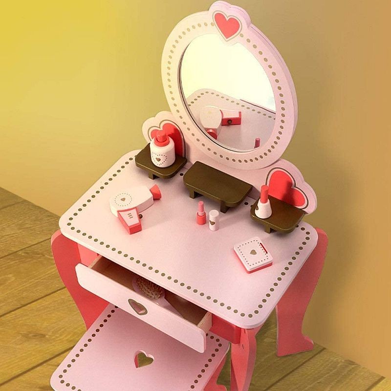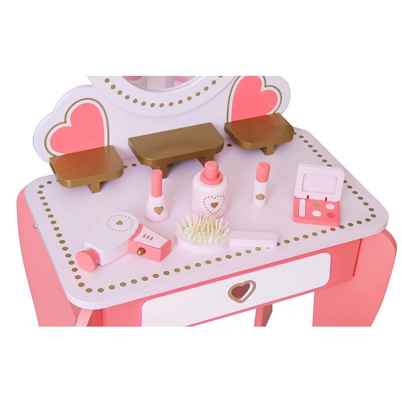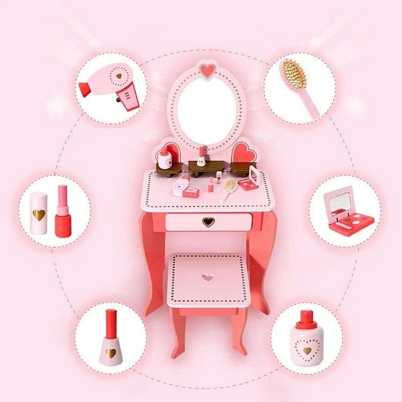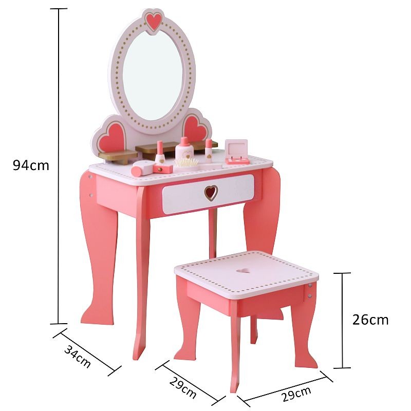 Setul este fabricat dintr-un lemn calitativ si rezistent, are un design clasic si este accesorizat cu inimoare decorative, fiind format dintr-o masuta de toaleta cu oglinda si un scaun. Este o jucarie superba, care va deveni in scurt timp piesa centrala din camera fetitei, fiind un mobilier feminin in nuante de roz, cu multe accesorii interesante.