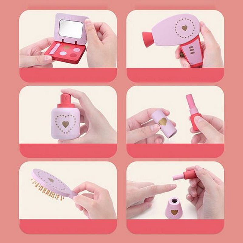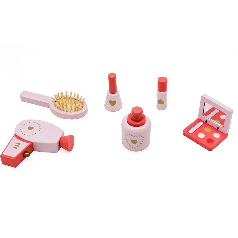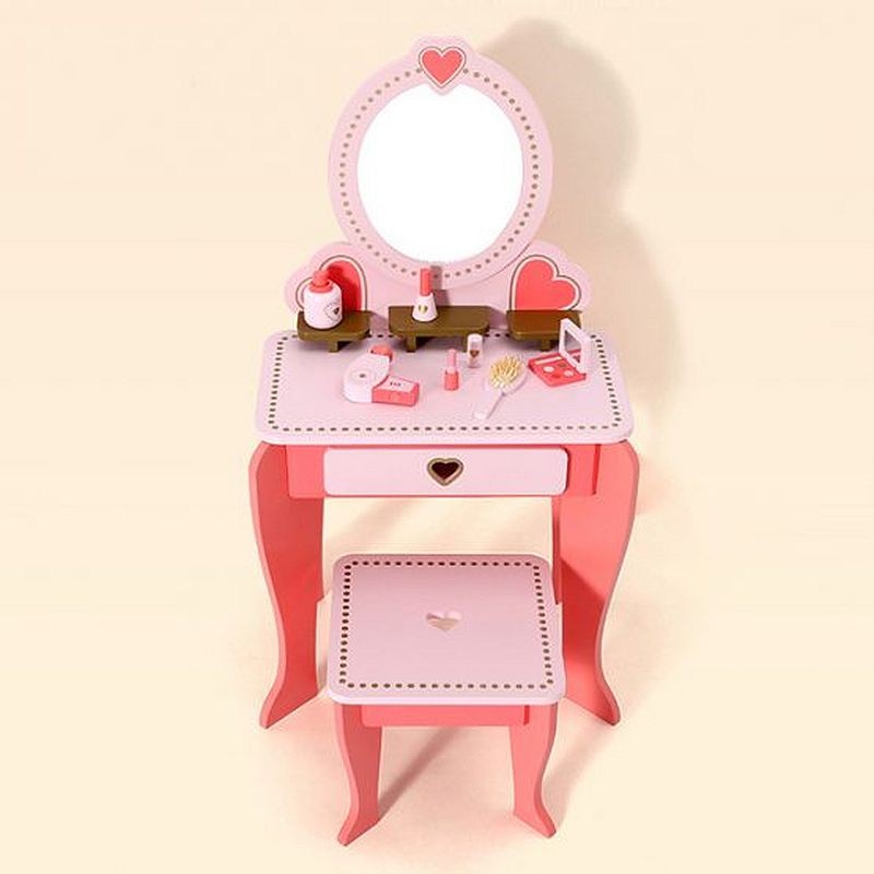 Mobilierul dispune de o oglinda ovala, un sertar in partea centrala si alte 3 rafturi pentru a depozita diverse accesorii, bijuterii sau produse. Pentru a diversifica jucaria, setul include 2 accesorii pentru ingrijirea parului, respectiv un uscator de par din lemn si o perie, precum si produse de machiaj: ruj, o paleta de farduri, oja si parfum.