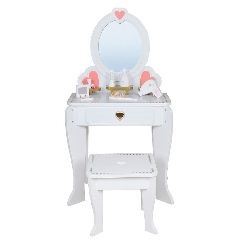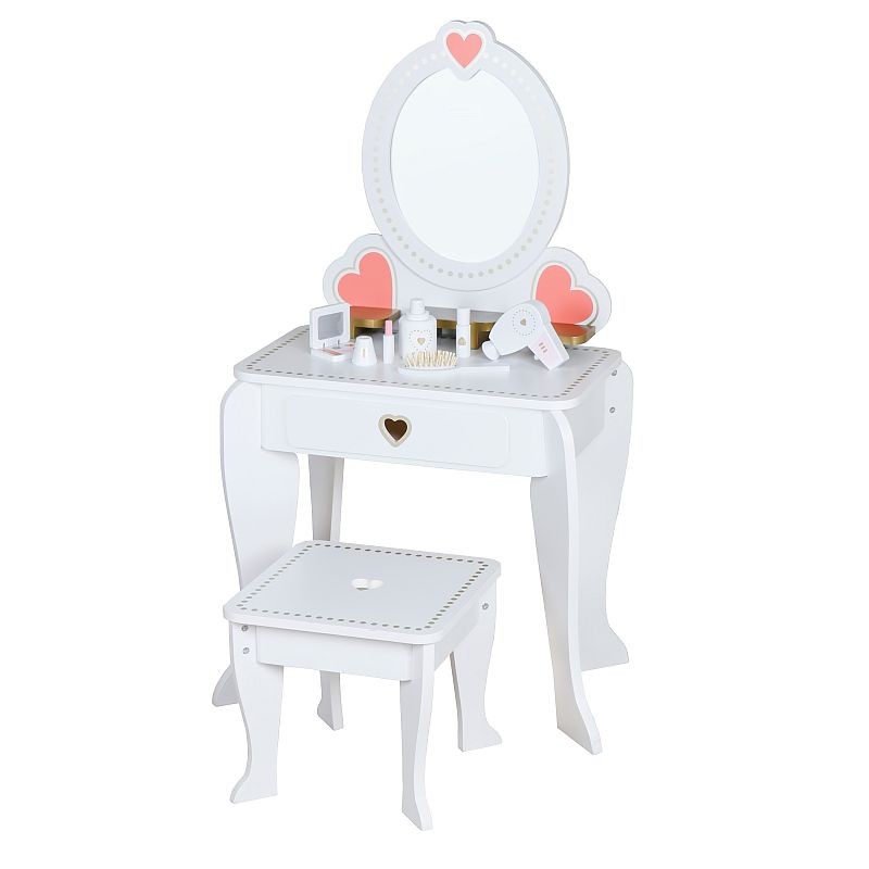 Mobilierul are un design clasic si rafinat, se va potrivi de minune in camera fetitei tale. Setul contine 6 articole pentru coafura si machiaj: un uscator de par si o perie, ruj, o paleta de farduri, oja si parfum.