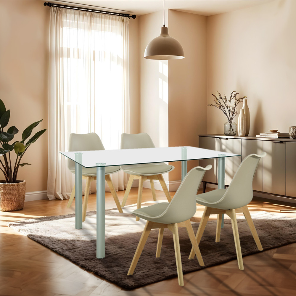 Descoperă setul de dining Leziter Midori 4+1, o alegere inspirată pentru o zonă de luat masa modernă și primitoare. Combinația dintre masa cu blat din sticlă securizată și cele 4 scaune bej confortabile oferă un aspect elegant, ușor de integrat în bucătărie sau sufragerie.