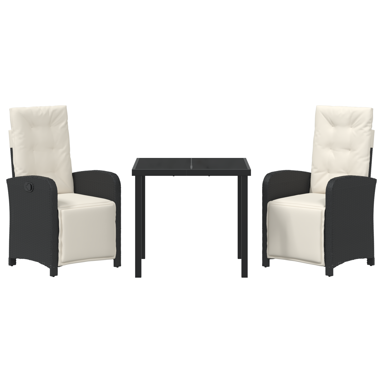 Set masă grădină 3 piese cu perne, Negru, Ratan Polimer, Masă grădină Neagră 80x80x73 cm, Sticlă temperată GartenMobel Dekor