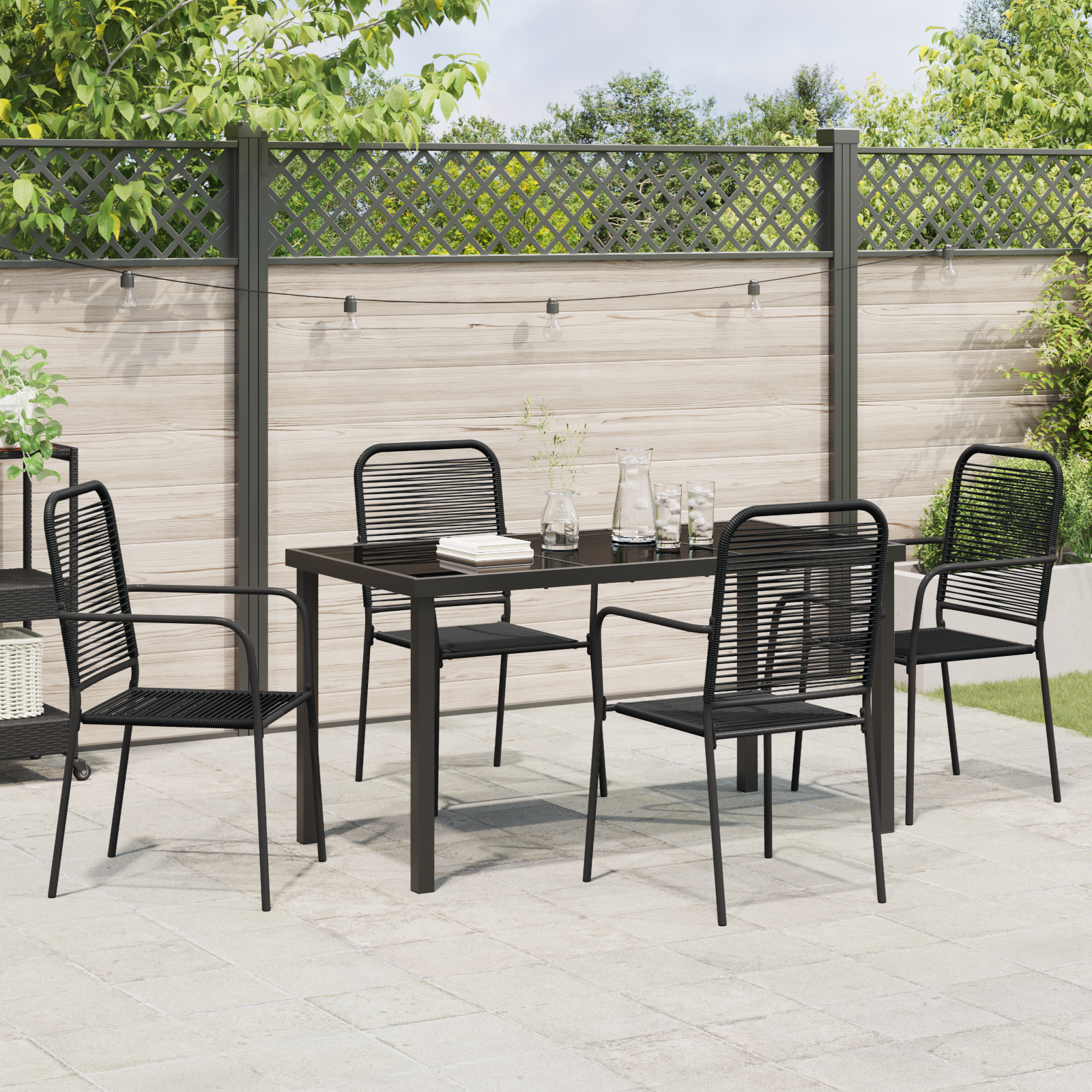 Acest set de masă pentru grădină combină stilul minimalist cu funcționalitatea, făcând un mix perfect pentru locurile de afară. Cu funia elegantă din bumbac negru în jurul unei rame din oțel vopsit electrostatic rezistent, nu doar că îți face terasa mai frumoasă, dar îți oferă și locuri confortabile pentru patru persoane.