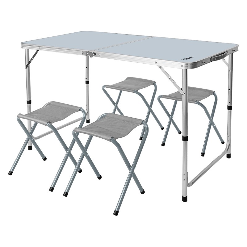 Ambalare: cartonGreutatea neta: 6880Materialul pentru executarea tubularului: Masa: blat din MDF, cadru din aluminiu, scaune: cadru din otel, scaun din poliesterNumarul de elemente din set: 1pliat: DaReglarea inaltimii: DaSetul contine:: 5Setul contine:: masa pliabilaSetul contine:: scaune 4 buc.