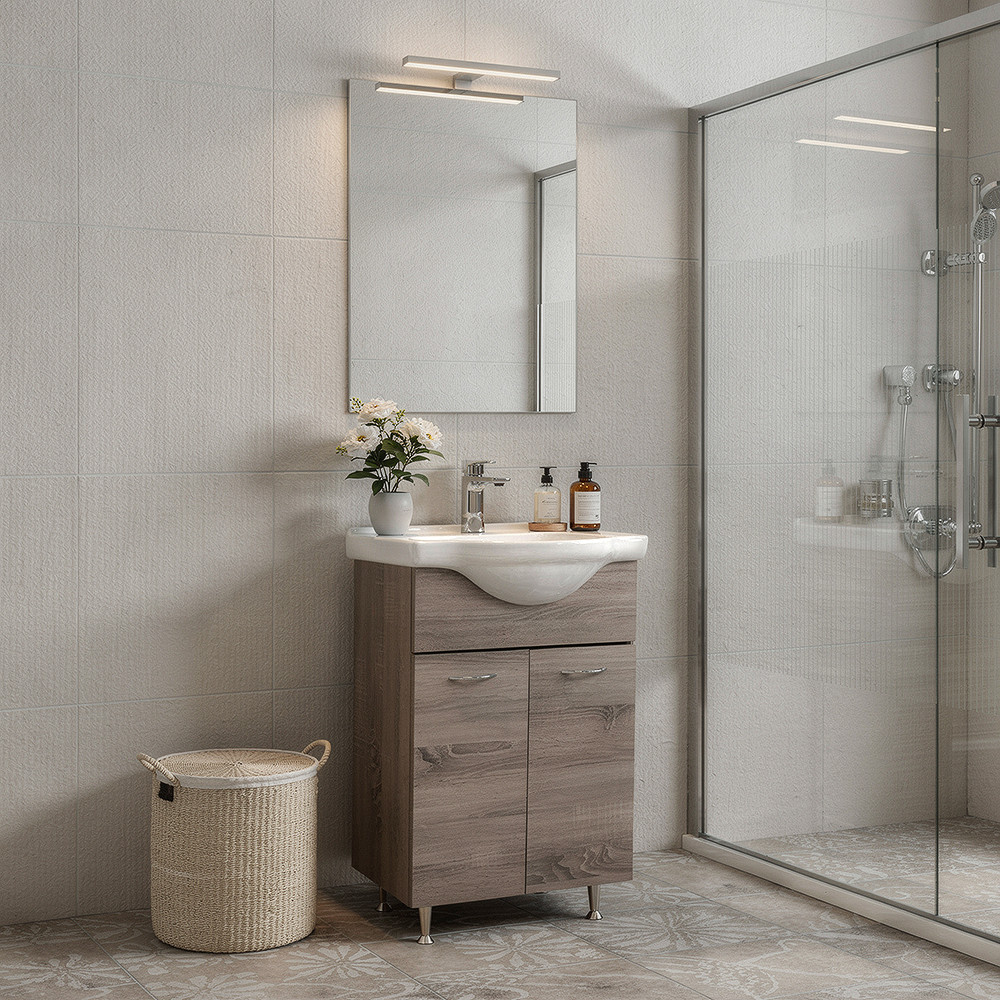 Leziter Ruben Prime 55 este un set mobilier baie practic și elegant, creat pentru băi de apartament, toalete de serviciu sau spații înguste. Finisajul tip lemn Rauna sil și liniile moderne se potrivesc ușor în amenajări contemporane, iar pachetul include și o oglindă baie CUBE, pentru un look aerisit.