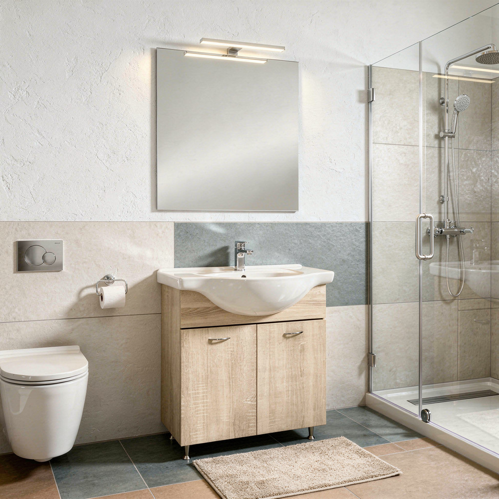 Setul mobilier baie Leziter Ruben Prime 75, in finisaj stejar Sonoma, este o alegere practica pentru bai moderne, bai de oaspeti sau apartamente. Primesti un pachet complet, cu lavoar ceramic si oglinda, astfel incat sa ai rapid un spatiu ordonat si placut vizual.