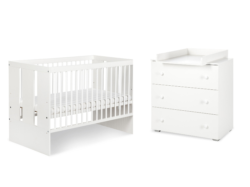Set mobilier bebe Klups Paula alb cu patut, comoda si saltea 120x60
