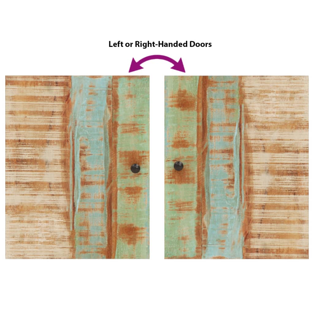 - Lemn masiv reciclat: Acest dulap este realizat din lemn masiv reciclat, combinat cu lemn prelucrat.Lemnul masiv reciclat constă din cherestea reutilizată, cum ar fi tec, lemn de mango, lemn de pin și fag.Aceste materiale sunt reciclate din clădiri vechi, cum ar fi fabrici, hale și bărci.