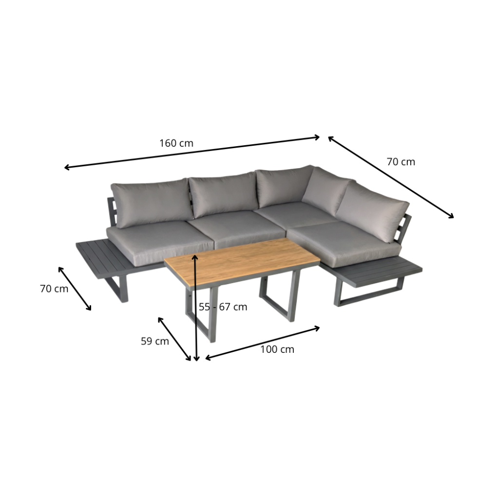 Cadrul din aluminiu vopsit în câmp electrostatic este durabil și rezistent la coroziune, fiind potrivit pentru utilizare frecventă în aer liber. Pernele groase, cu husă din poliester și umplutură din spumă și fibră, oferă un confort plăcut la ședere. Masa reglabilă pe două niveluri de înălțime este practică atât pentru cafeaua de dimineață, cât și pentru servirea gustărilor sau cinei pe terasă.