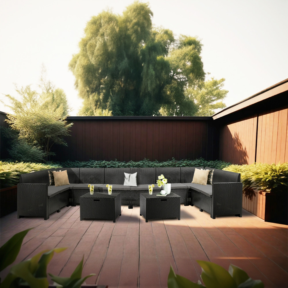Alege un set de mobilier de grădină spațios și elegant, ideal pentru terasă, curte sau zone exterioare de relaxare. Modelul Nero V cu 10 locuri impresionează prin designul modern cu aspect de technoratan, nuanța grafit și confortul oferit de pernele incluse, fiind potrivit pentru întâlniri în familie sau seri petrecute cu prietenii.
