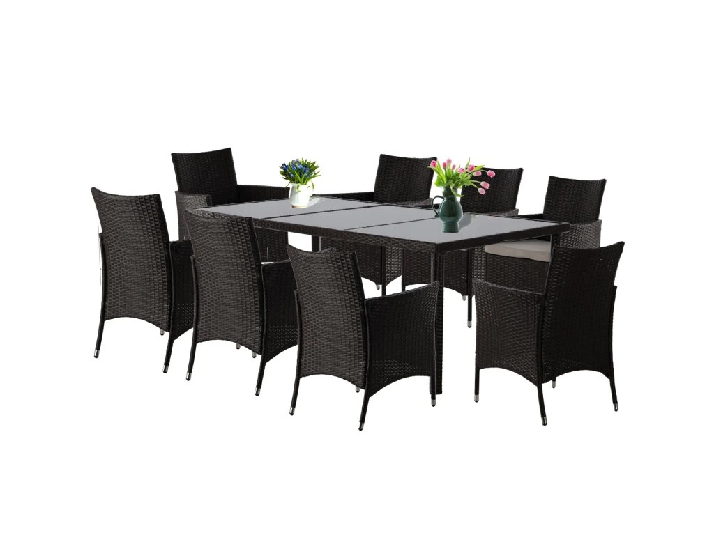 Set mobilier de gradina cu 8 scaune, masa din ratan si blat din sticla, maro