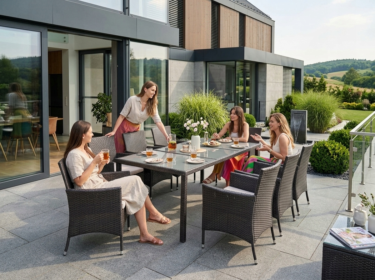 Utilizare: recomandat pentru gradina, terasa, foisor, curte sau zona de dining exterior. Pentru o durata de viata mai buna, se recomanda acoperirea sau depozitarea setului in perioadele cu vreme nefavorabila.