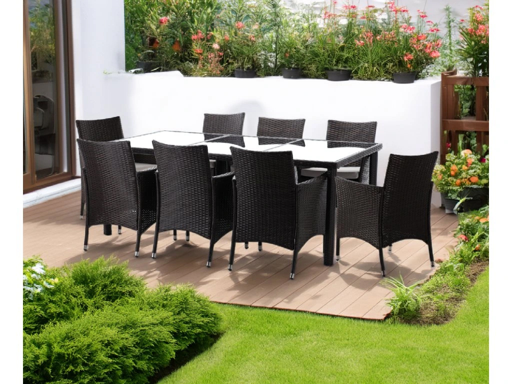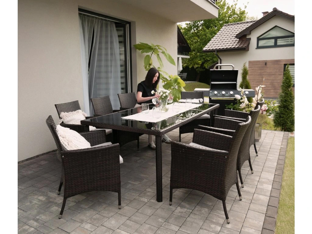 Transforma terasa sau curtea intr-un spatiu primitor cu acest set mobilier de gradina format din masa si 8 scaune. Designul elegant din ratan maro se potriveste usor in amenajari moderne sau clasice, iar cadrul din otel zincat ofera stabilitate si rezistenta pentru utilizare frecventa in exterior. Blatul din sticla securizata completeaza aspectul rafinat si este usor de curatat dupa fiecare masa in aer liber.