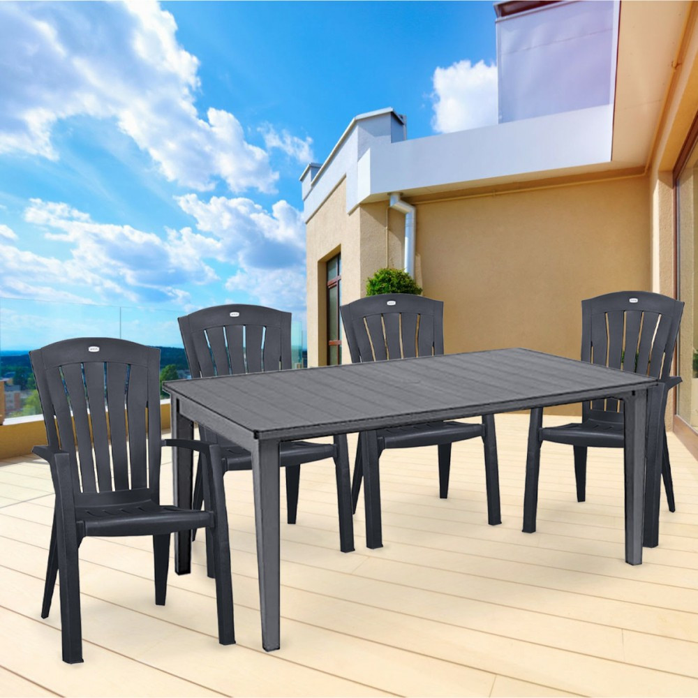 Acest set de grădină 4+1 include o masă spațioasă și 4 scaune confortabile, fiind potrivit pentru mic dejunuri în familie, cine în aer liber sau momente de relaxare alături de cei dragi. Nuanța grafit se integrează ușor în decoruri exterioare moderne sau clasice.